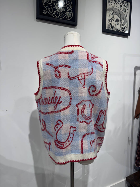 Howdy sweater vest with gingham western icon print red blue