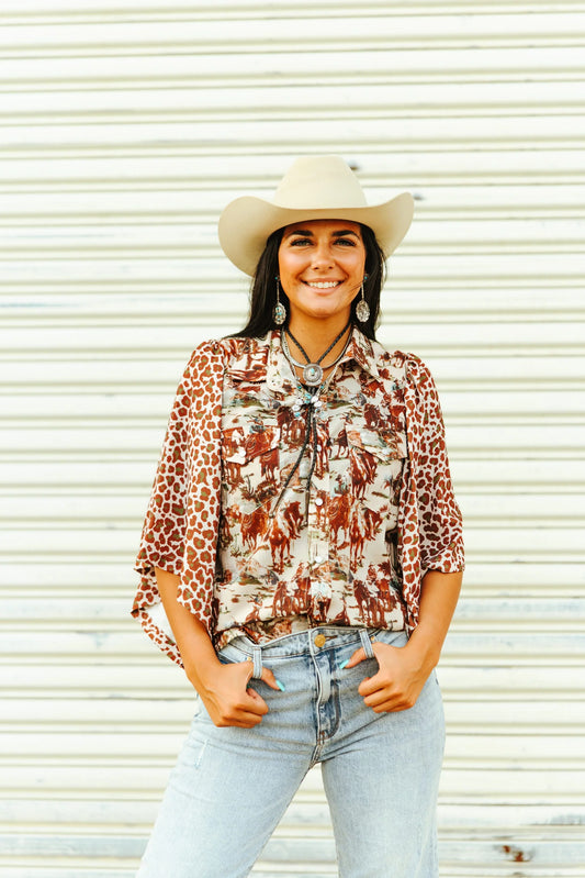 Boot Stitch Embroidered Top with Turquoise Snaps