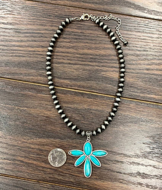 18" Faux Navajo Pearl Necklace w/ Turquoise Blossom Pendant
