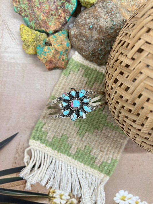 Handmade Sterling Silver Cotton Candy, Kingman Turquoise Cuff Bracelet with Signed Nizhoni