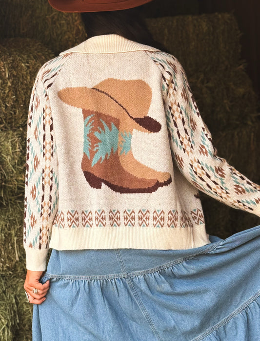 WESTERN CREAM BOOT PRINTED KNIT SWEATER