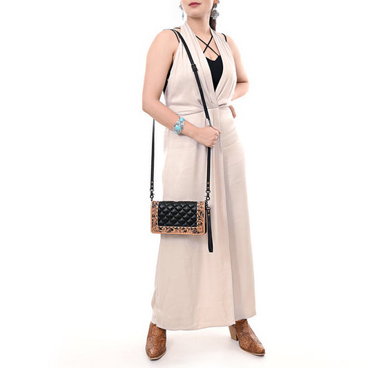 Black Genuine Leather Crossbody Bag with Hand-Tooled Details and Fringes
