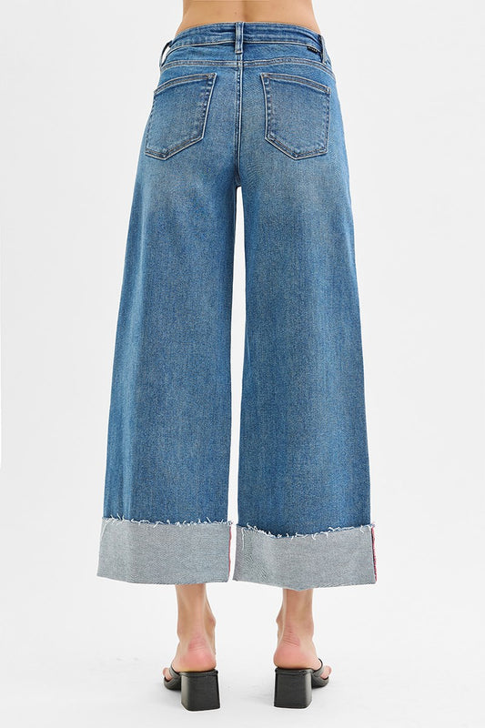 RUFFLE BOTTOM STONE WASHED CHAMBRAY PANTS