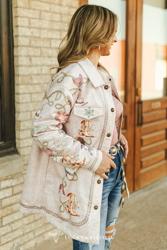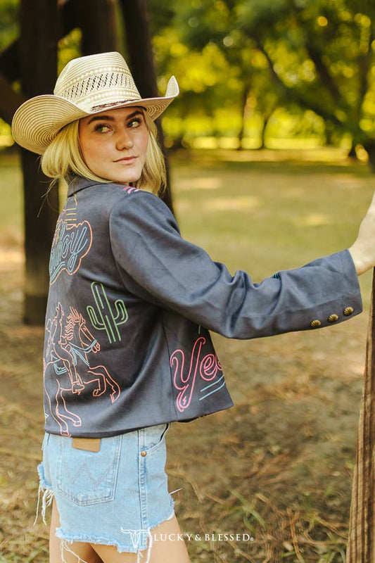 Grey Suede Button Down Printed Yeehaw Western Jacket