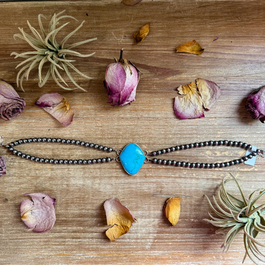 Double Strand Sterling Silver & Turquoise Choker - 13" + Extender - 6 mm Pearls