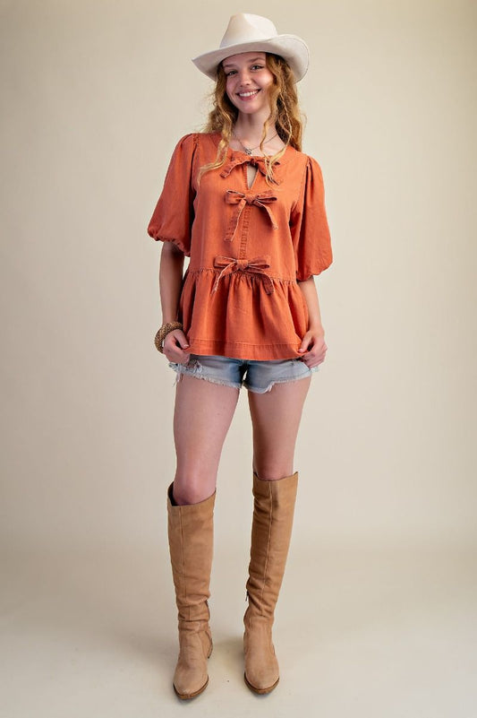 BUBBLE SLVS BOW FRONT DENIM PEPLUM TOP