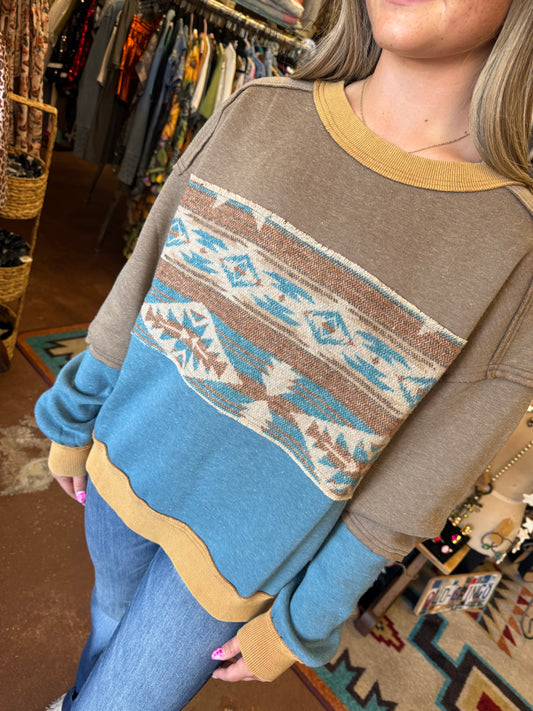 ETHNIC PRINT MIX COLOR BLOCK PULLOVER