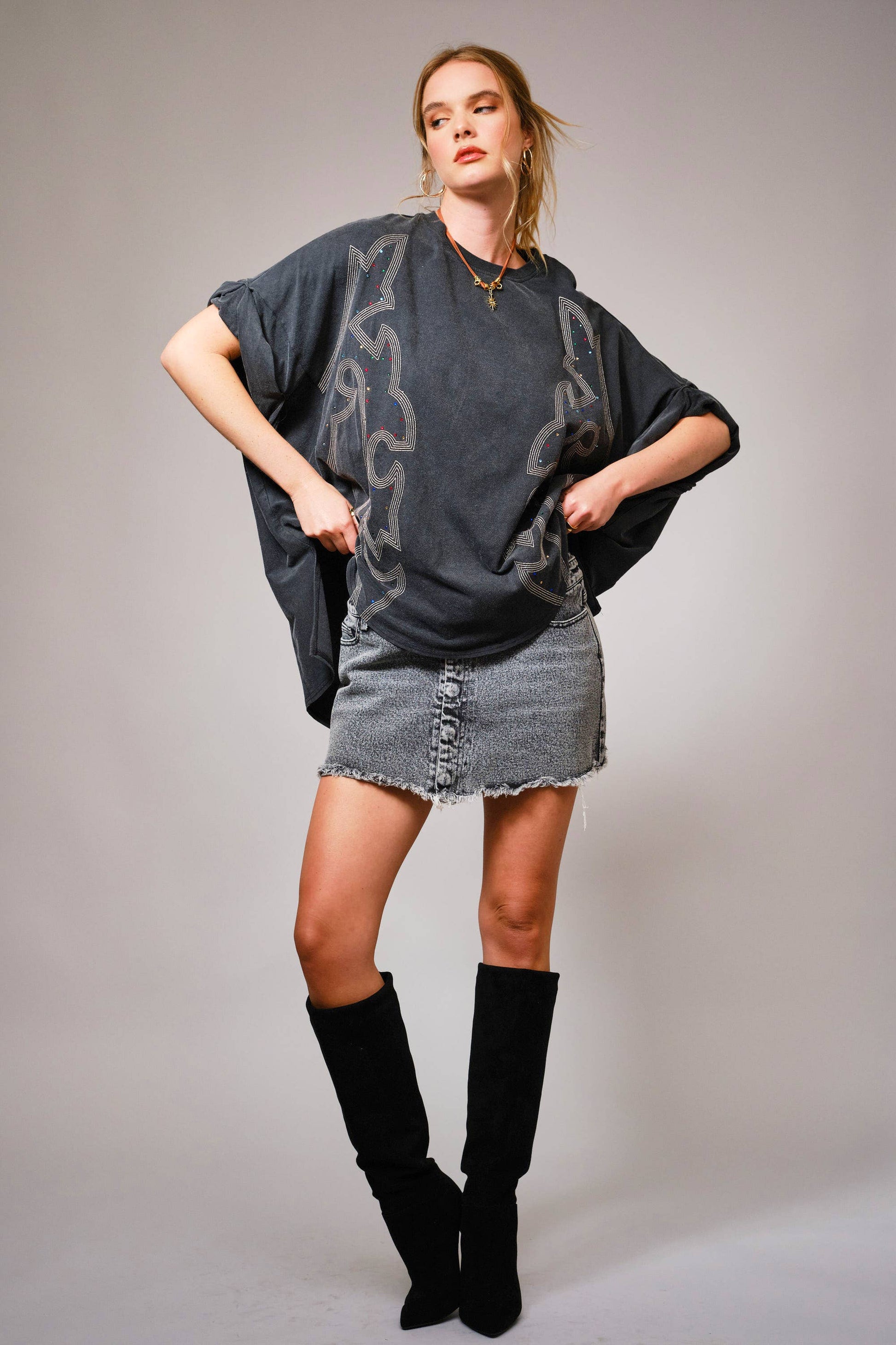 Oversized dolman tee with western stitchwork and multi color stone details in soft garment wash black