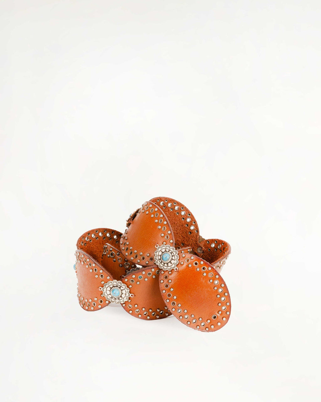 Medallions in rich caramel leather are accented with metal studs, while conchos with turquoise stones link them together, capturing a tribal-inspired spirit. With its high-quality hardware and Western flair, this belt is a unique statement accessory,