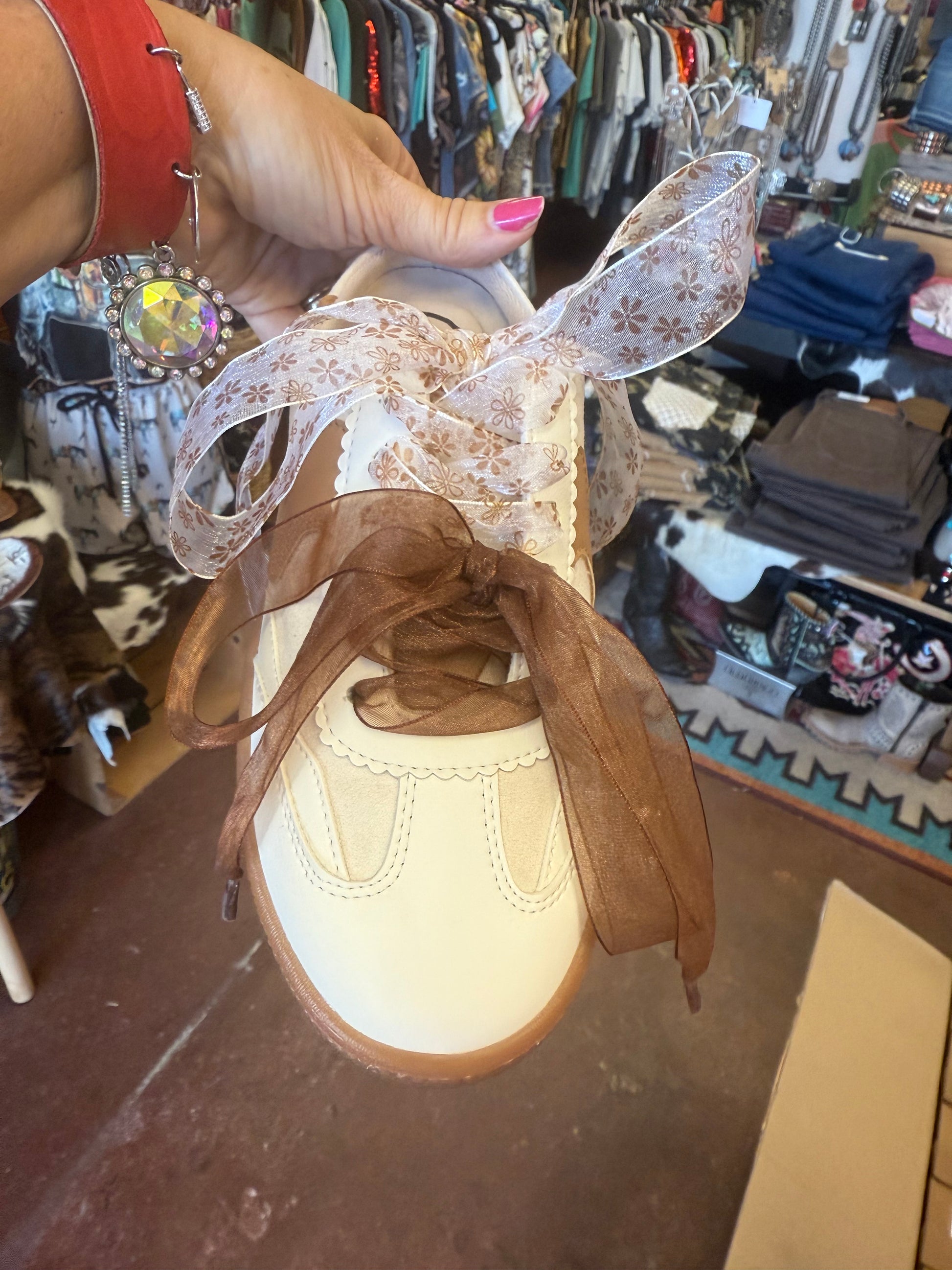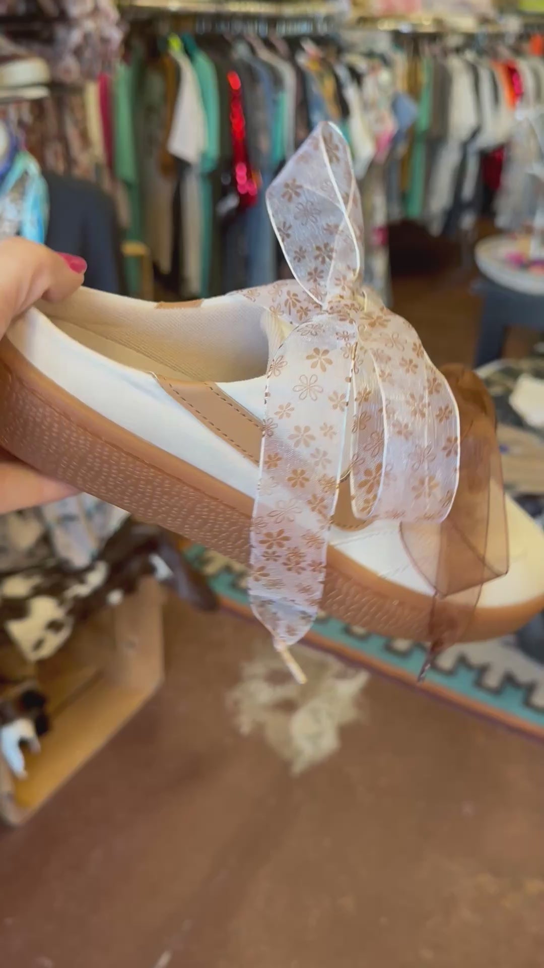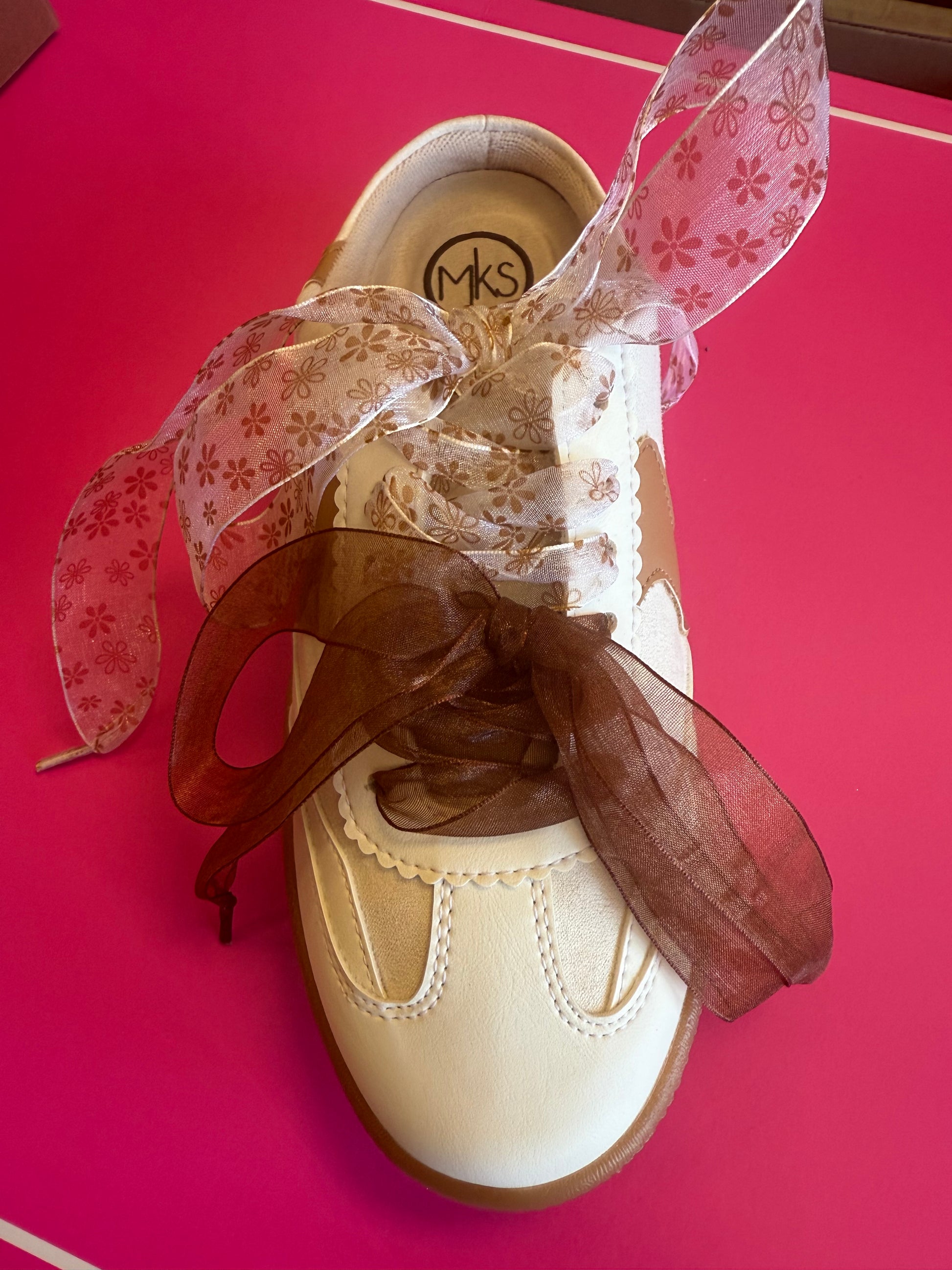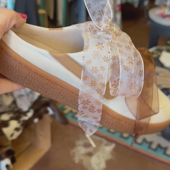 Elevate your casual wardrobe with these stunning white sneakers adorned with elegant trim and charming bows.