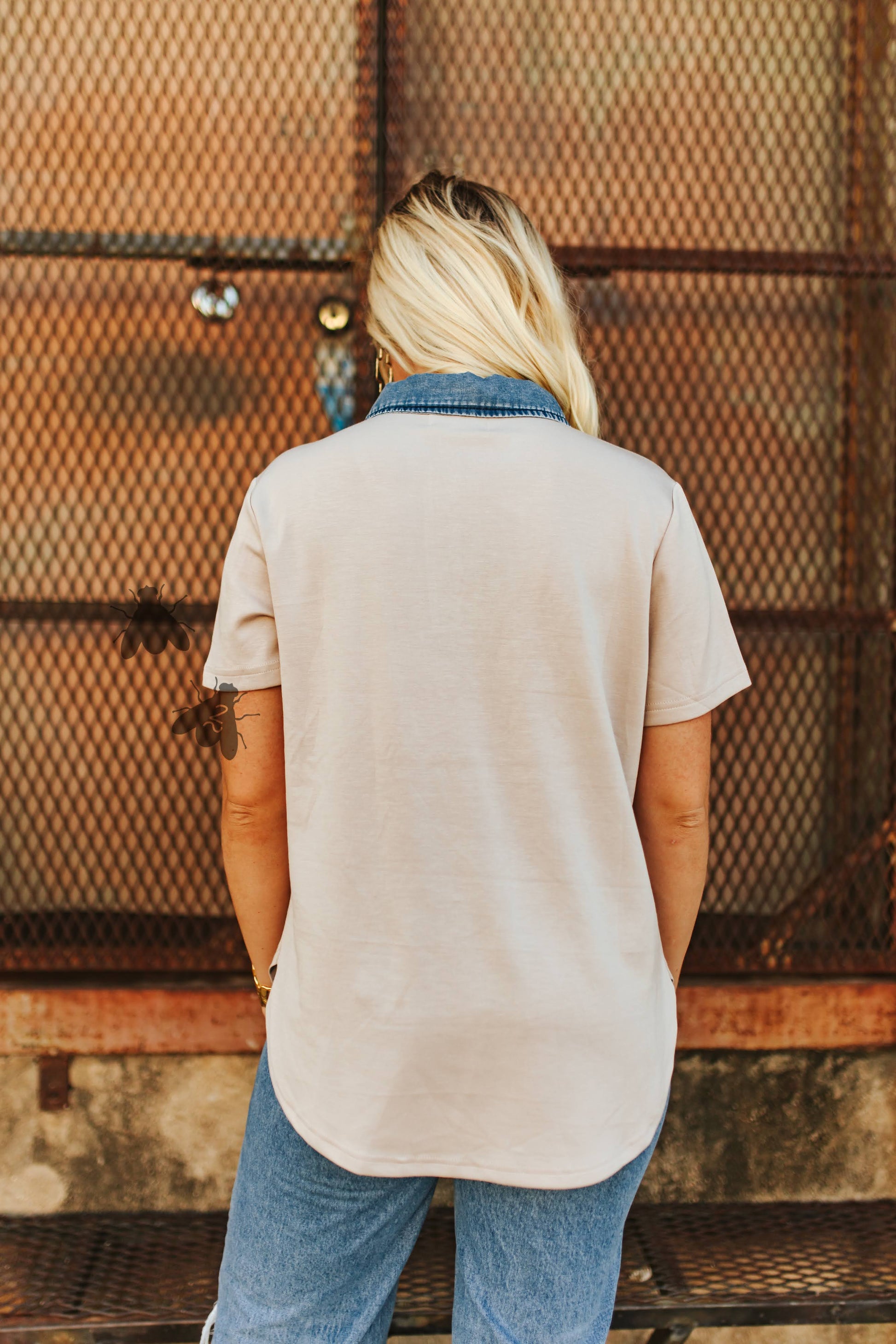 we took the layering elements you want from a 1/s button up but put in on our CLOUD BASIC fabric short sleeve top.