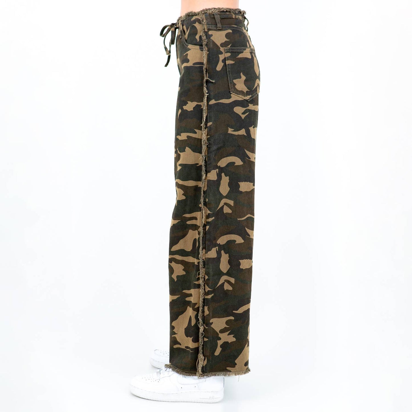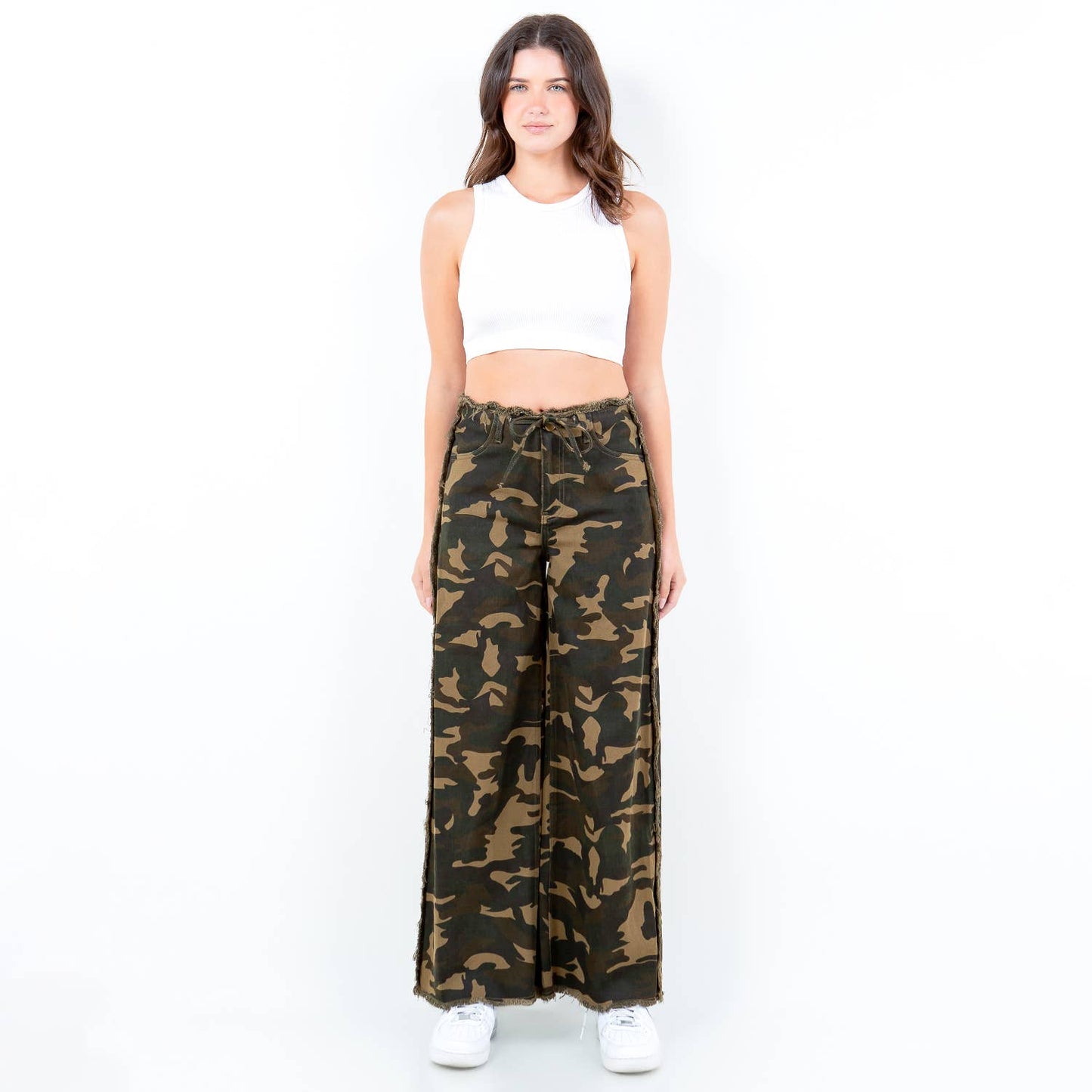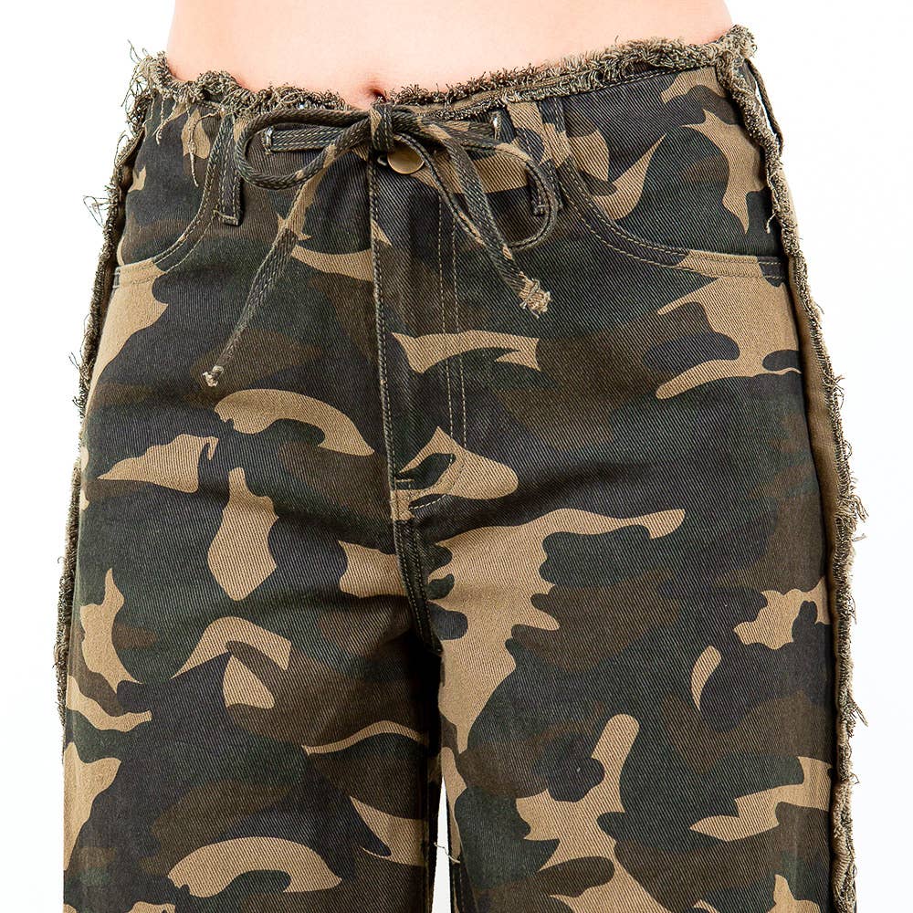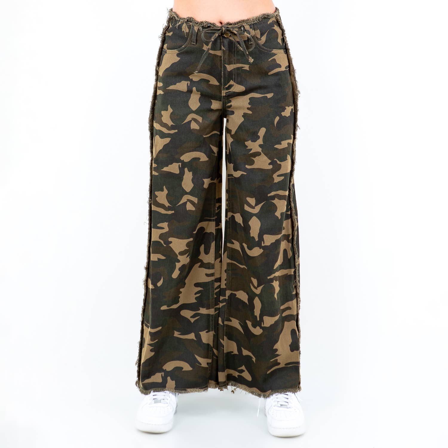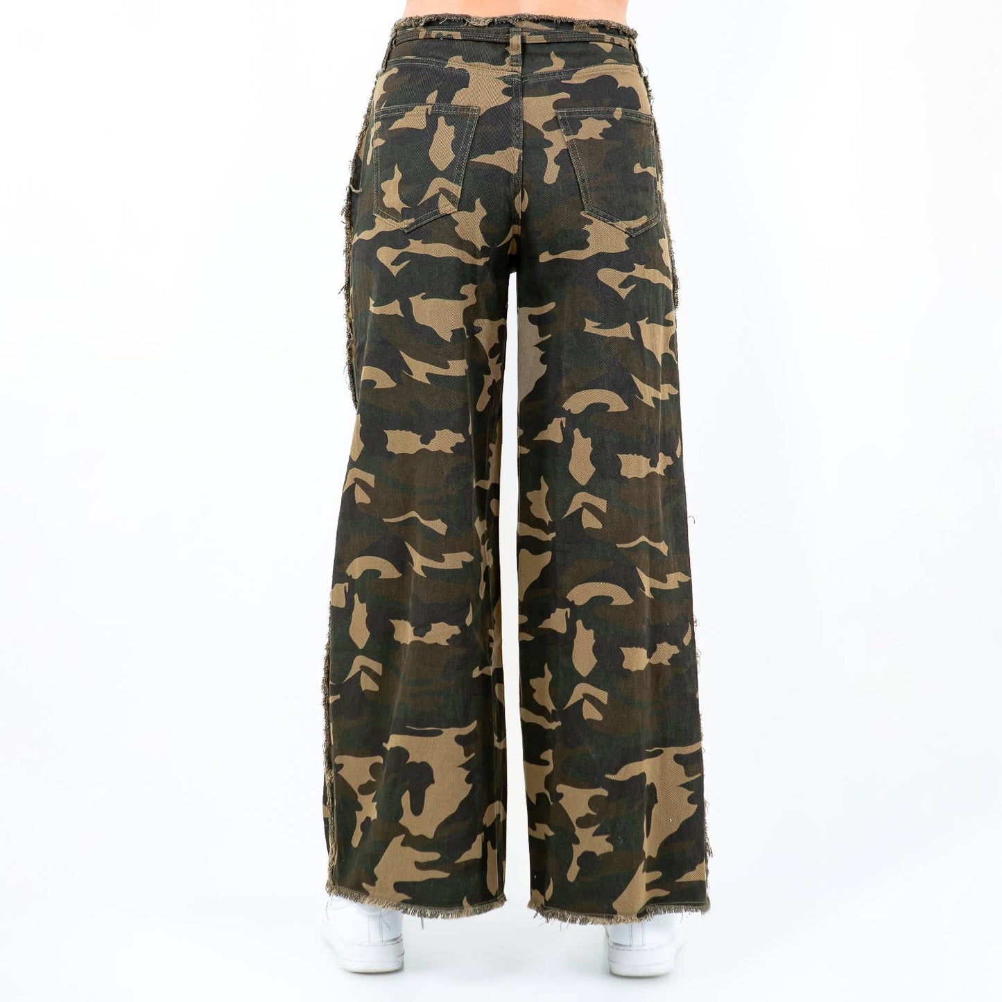 CAMOUFLAGE FRAYED EDGE WIDE LEG PANTS - BUTTON WAIST CLOSURE - WIDE LEG, LOOSE FITTING - FRAYED EDGE TRIMS