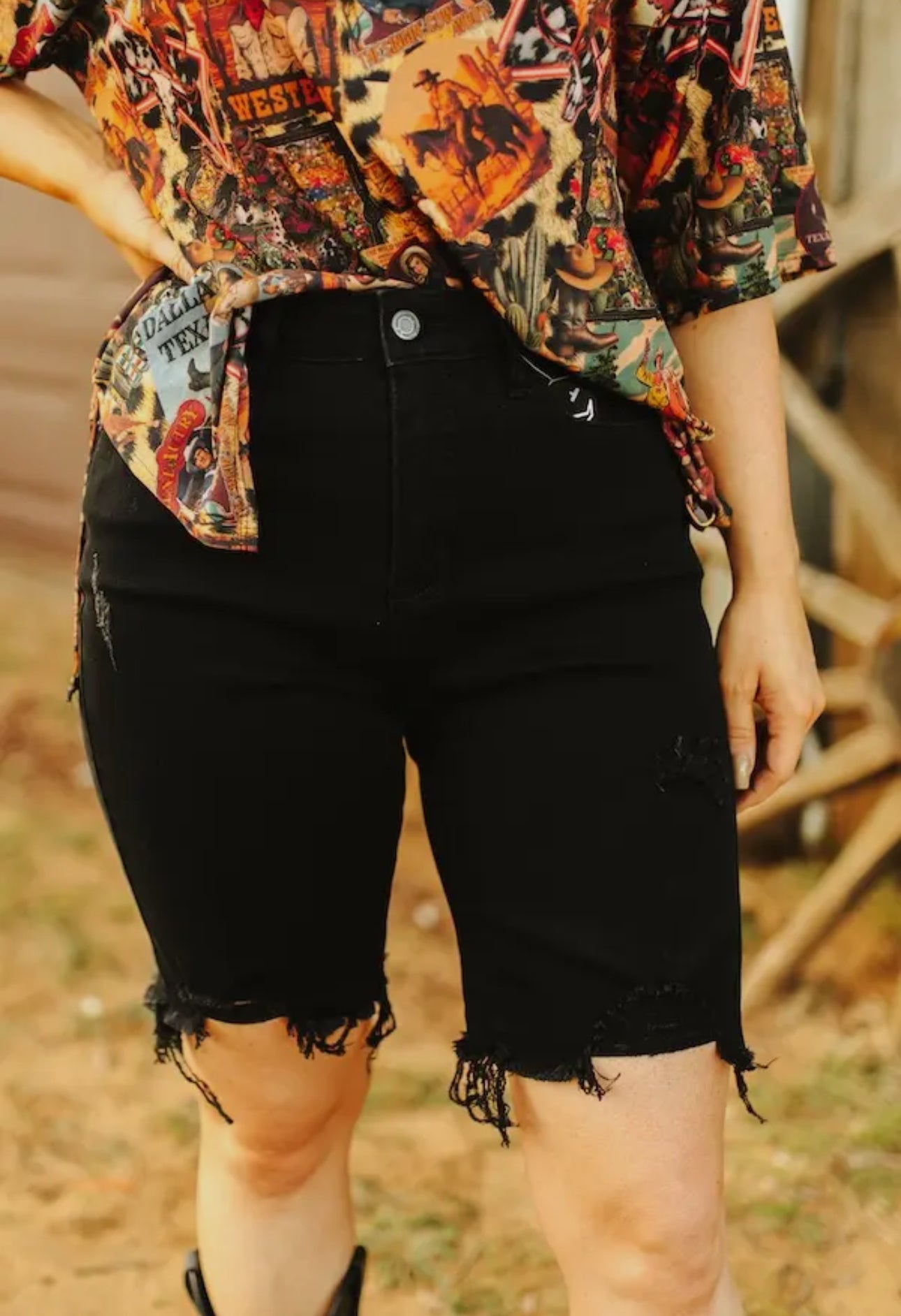 Denim distressed bermuda shorts with frayed hem. 5 pocket Jean. Comfortable adjustable elastic waistband so there are no gaps in your waistline. Curved back yoke that makes the butt look better. Super soft and stretch fabric for the best comfort.