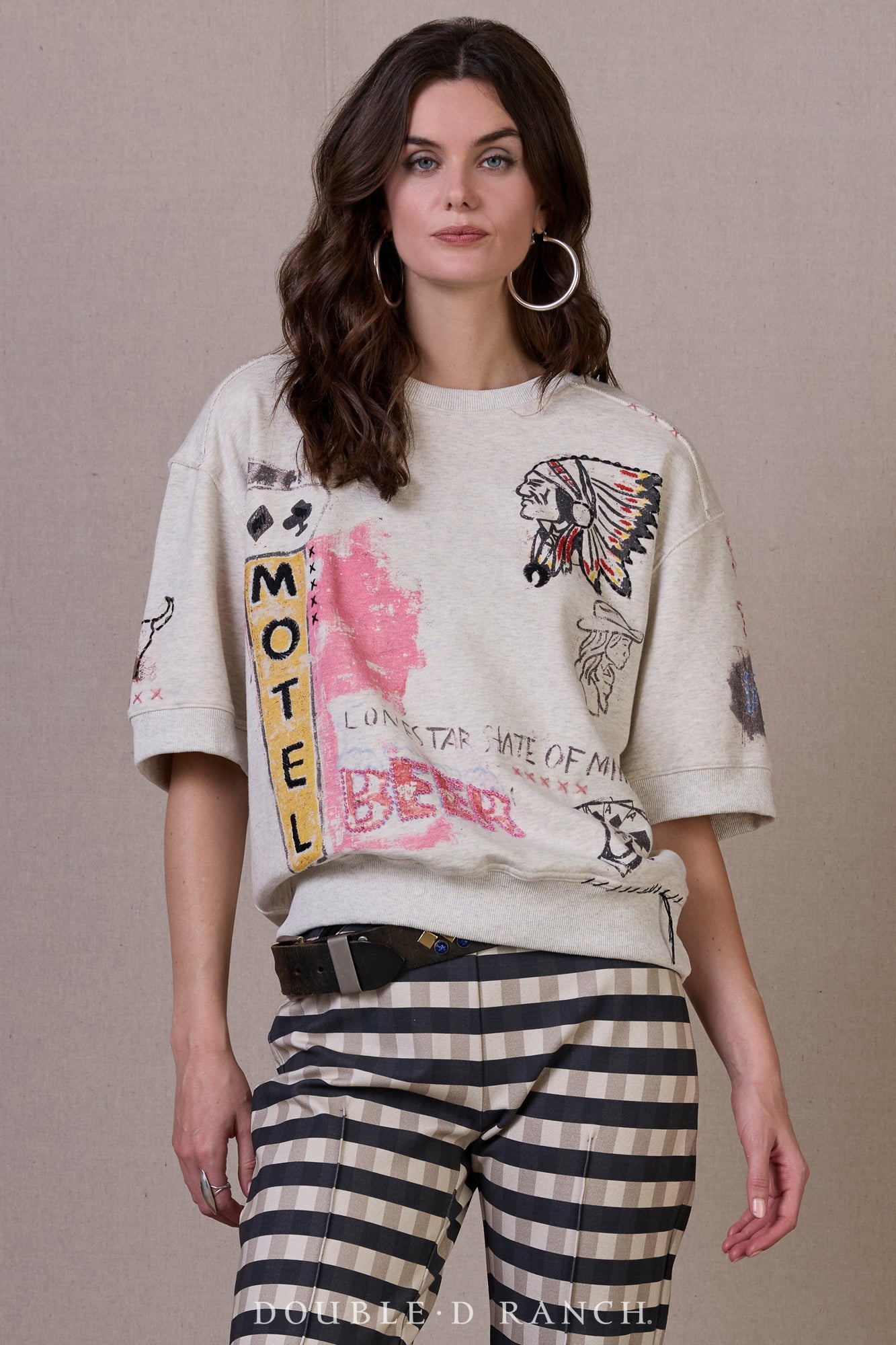 We accidentally sneak-peeked this top in a social media video about something else, and our phones lit up immediately - sold the one right off the model! This is an irresistible must-have from Cowboy Graffiti. Crafted in 100% cotton, it feels just like your favorite sweatshirt, but it's embellished with all the essence of the collection and colorful artwork elements from our creative collaboration with Ryan Buenning. Plus, it's short-sleeved, so you can rock it year-round!