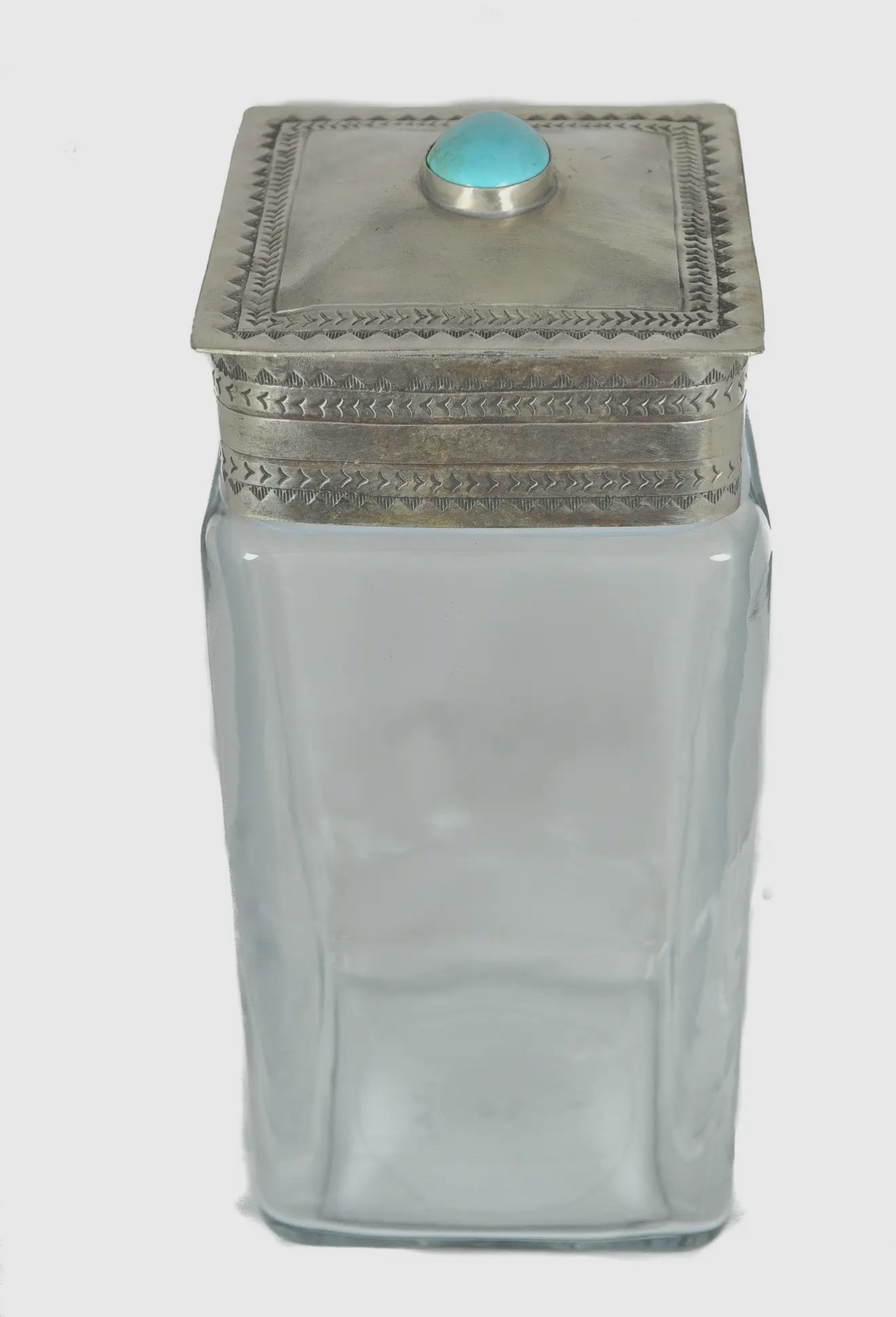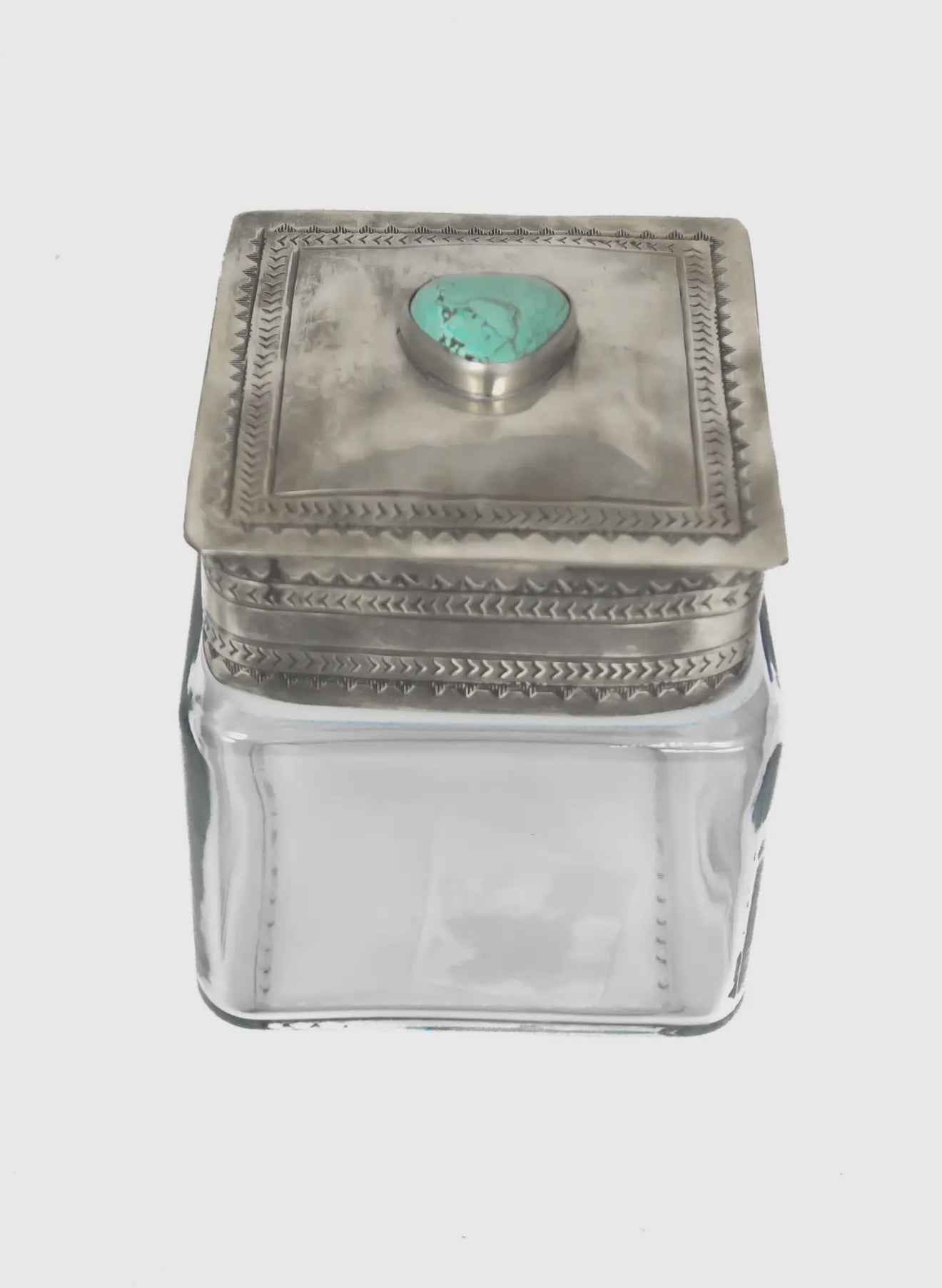 Introducing the Glass Bottom Canisters with Silver & Turquoise accents from J.Alexander Rustic Silver. This artisanal piece is hand-tooled by skilled craftsmen, using time-honored techniques. Crafted from nickel silver, it features a unique finish that resembles a vintage look, complete with intentional darker spots on the metal. The turquoise detailing is hand-selected in our Dallas shop, ensuring only the finest stones adorn our products. This canister is not just a storage solution, but a piece of art that pays homage to classic Navajo silversmiths of the late 19th and early 20th centuries.