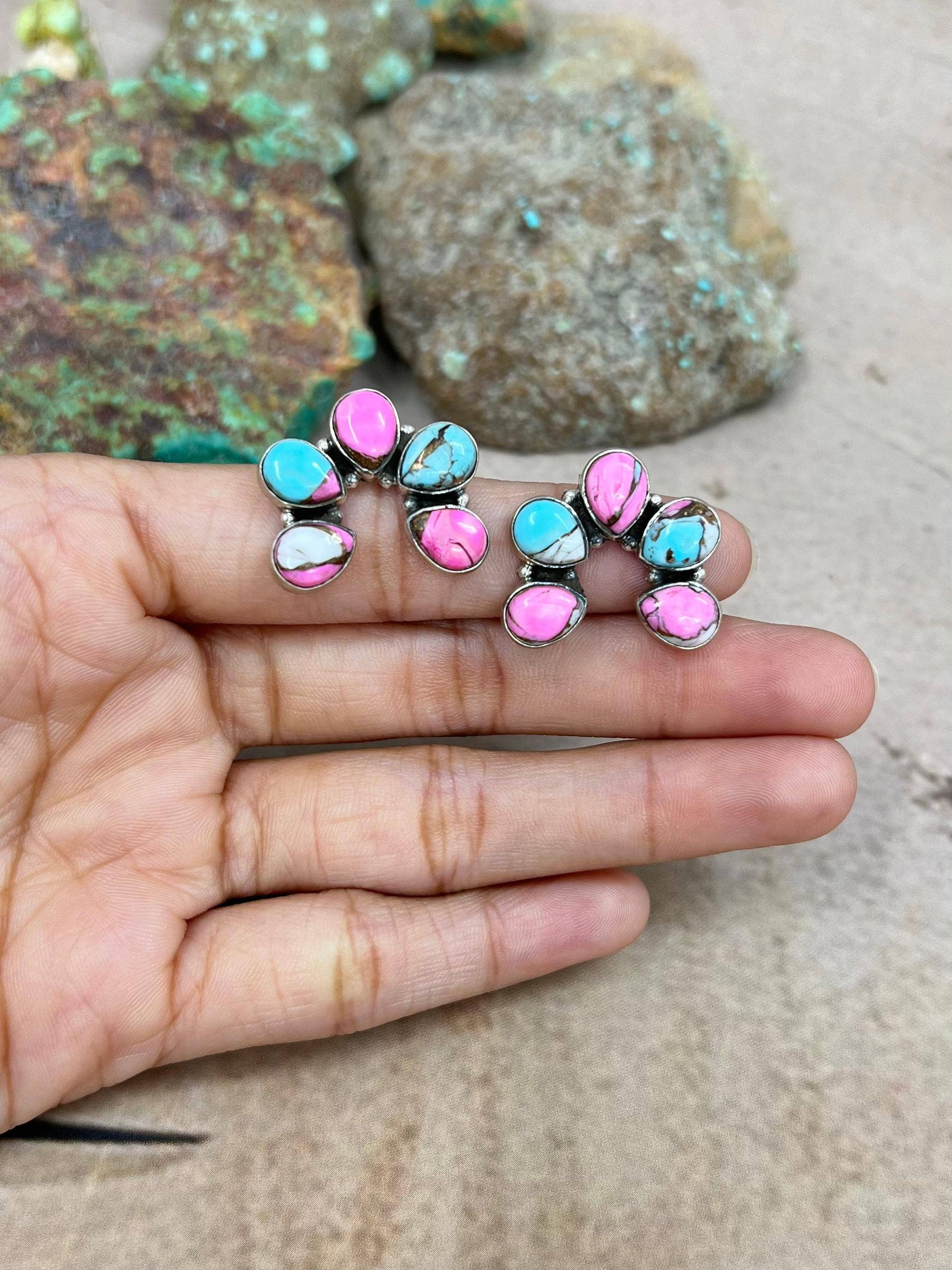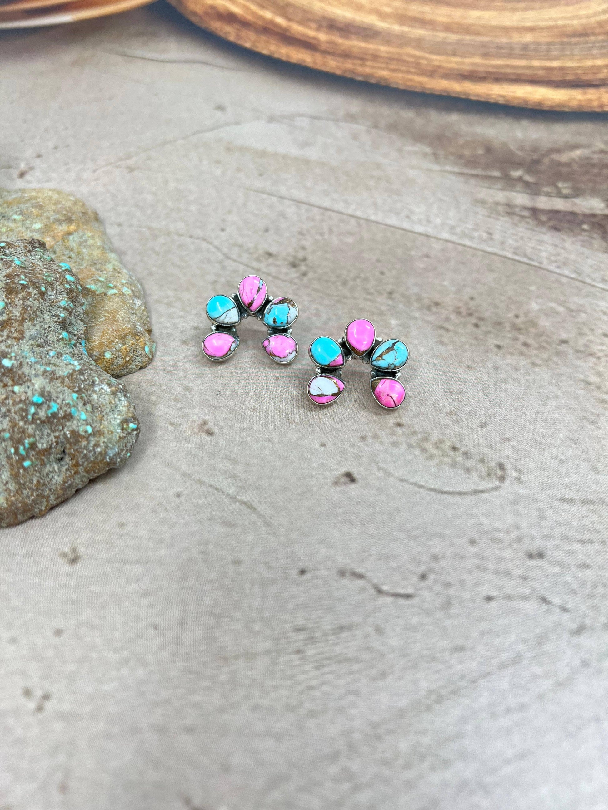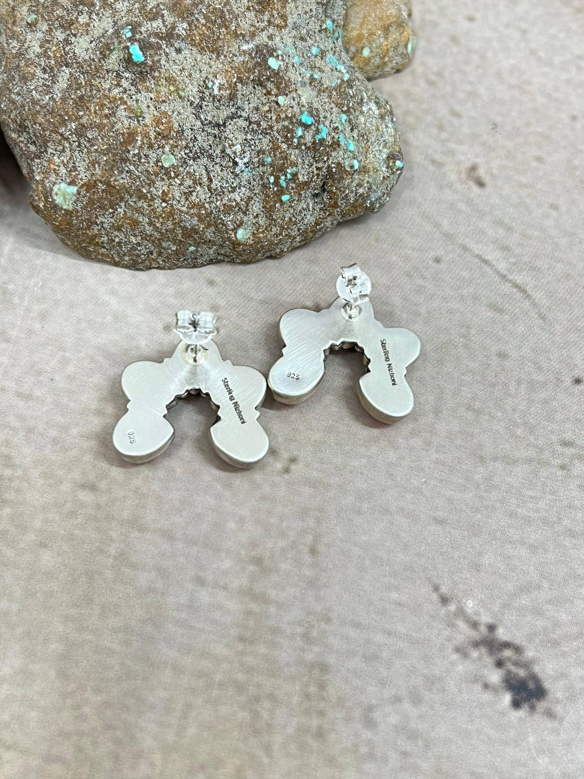 Handmade Sterling Silver Cotton Candy Turquoise Squash Blossom Post Earrings with Signed Nizhoni