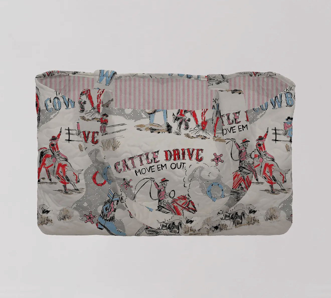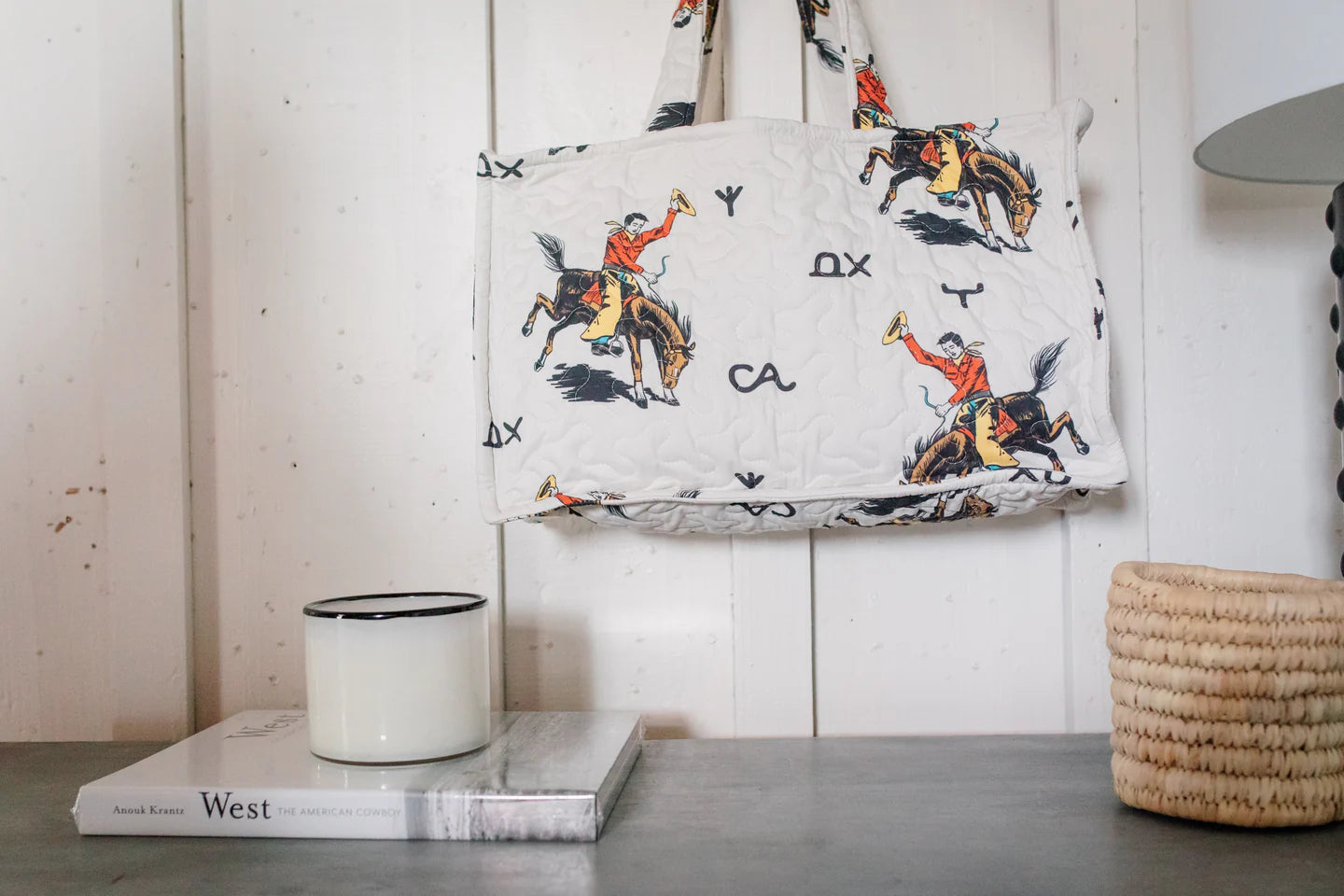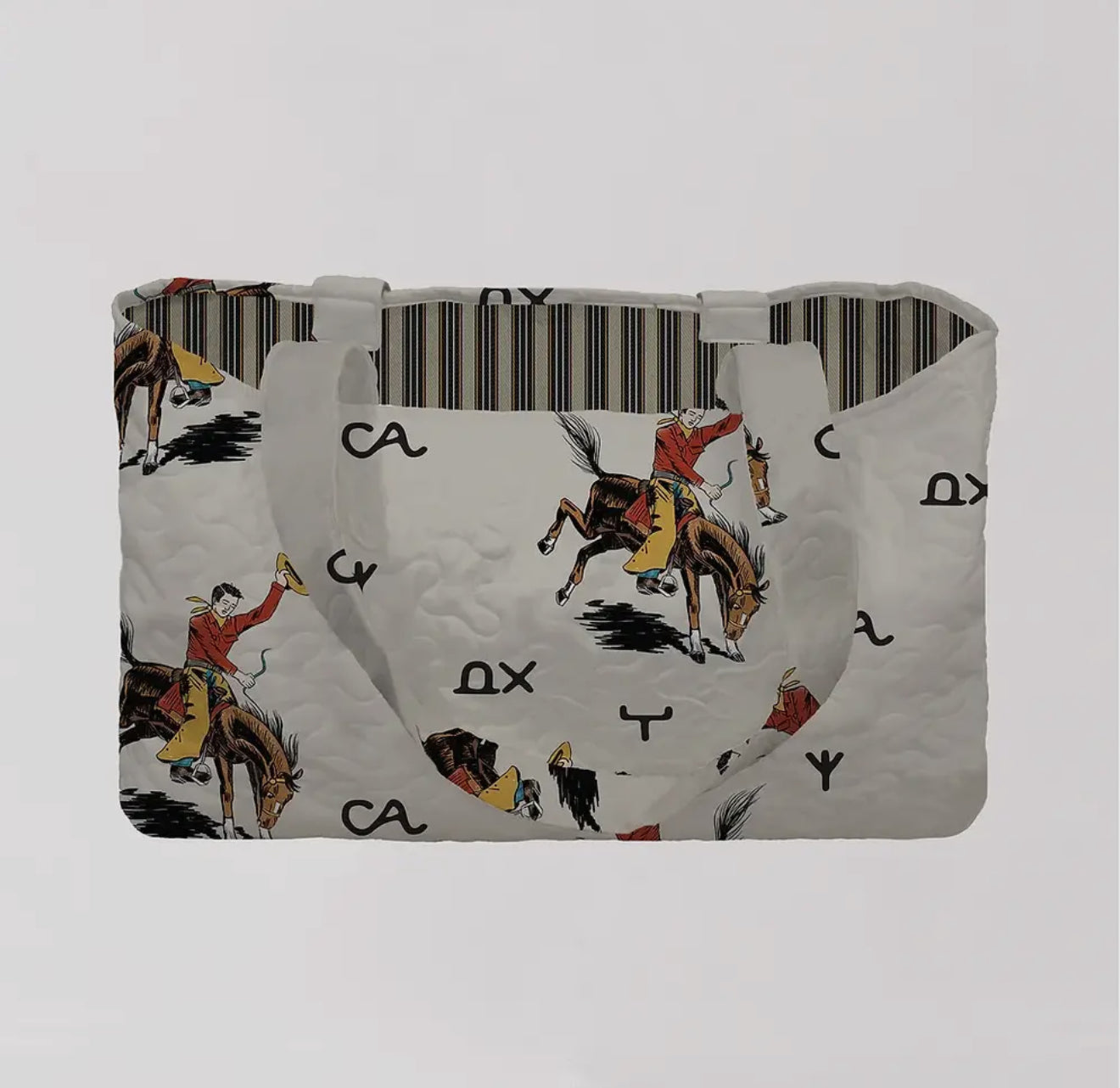 Discover our versatile and fashionable quilted tote, proudly made in Fort Worth, Texas. Crafted with care and designed for your busy life, the Lazy J Quilted Tote is not only a fashion statement but also a functional accessory. With the convenience of being machine washable on cold, it's a bag that can keep up with your everyday adventures. Explore our collection and experience the perfect blend of Texan craftsmanship and easy care. Elevate your style, and simplify your life with the Lazy J Quilted Tote.