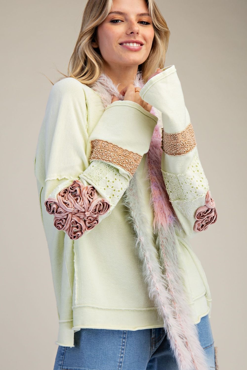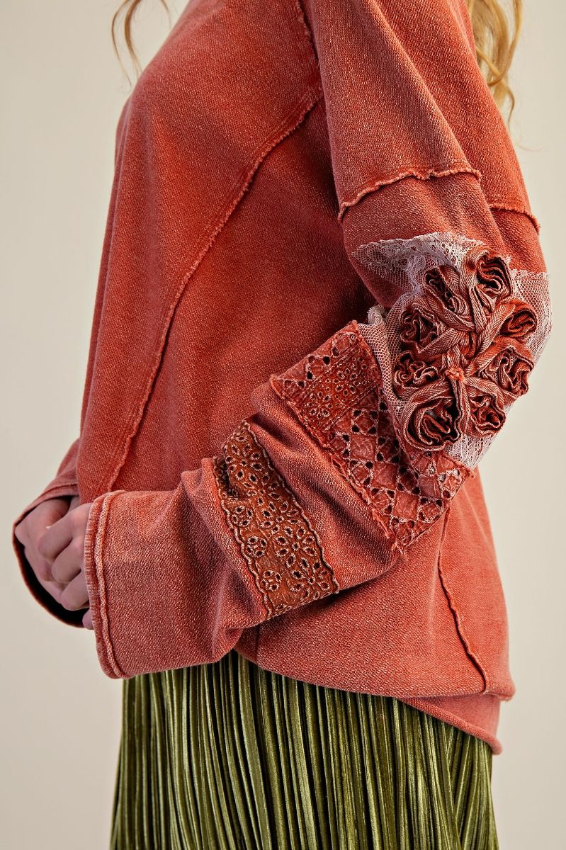 - FLORAL EMBO/LACE & EYELET PATCHWORK DETAIL ON SLEEVES