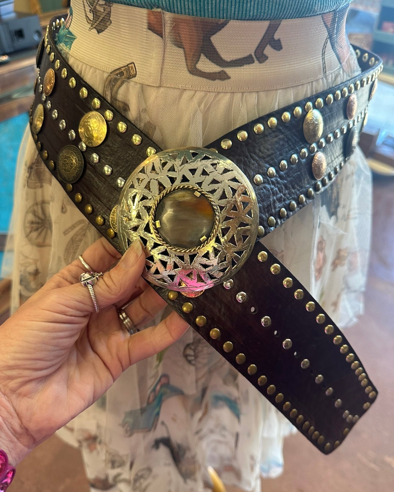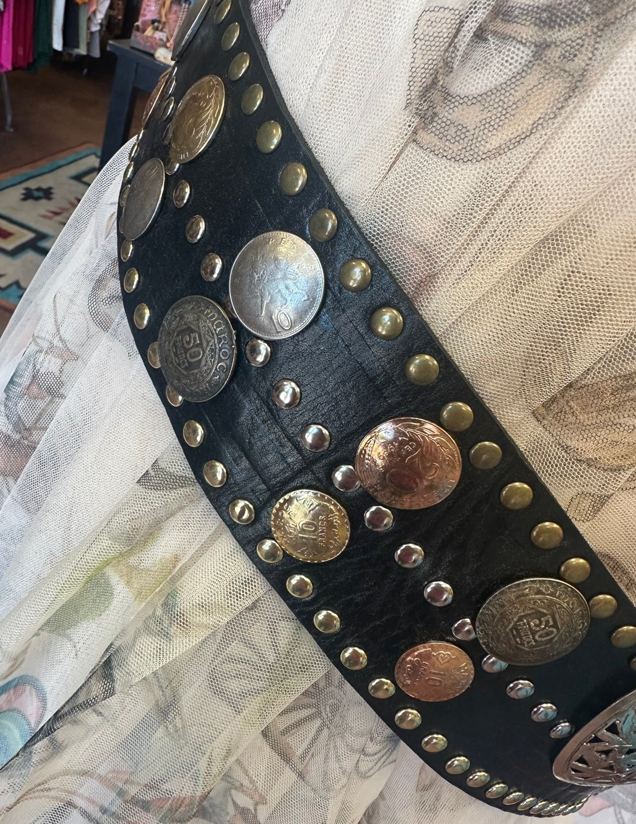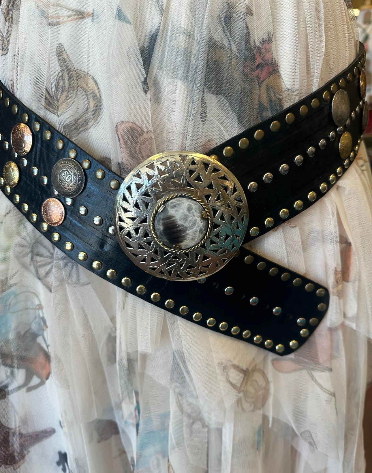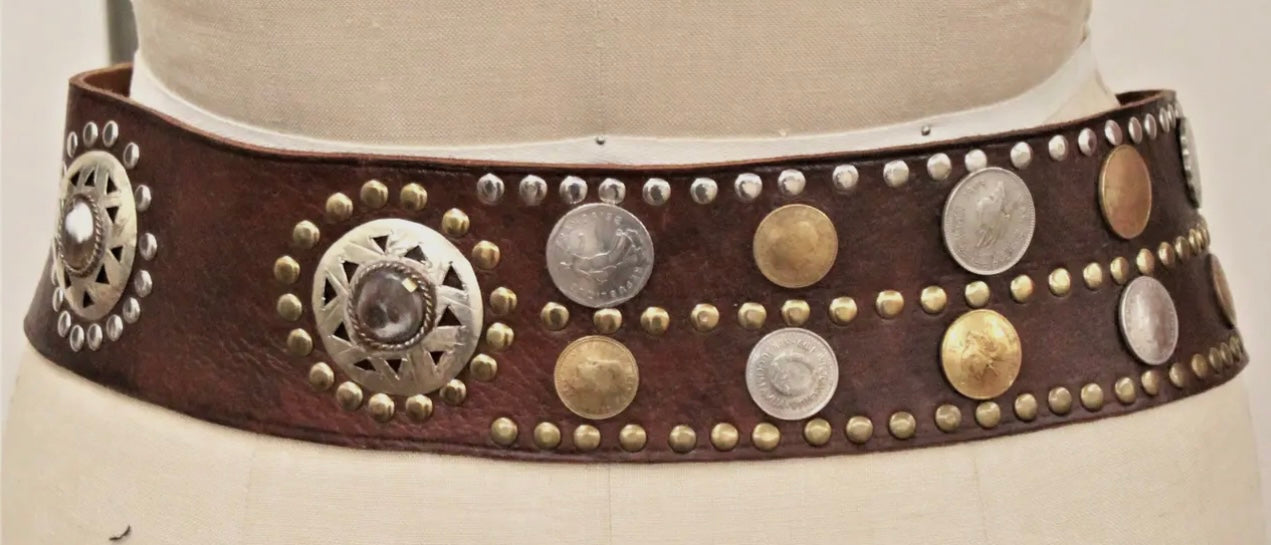 Leather belt with metal, studs, coins and stone accents