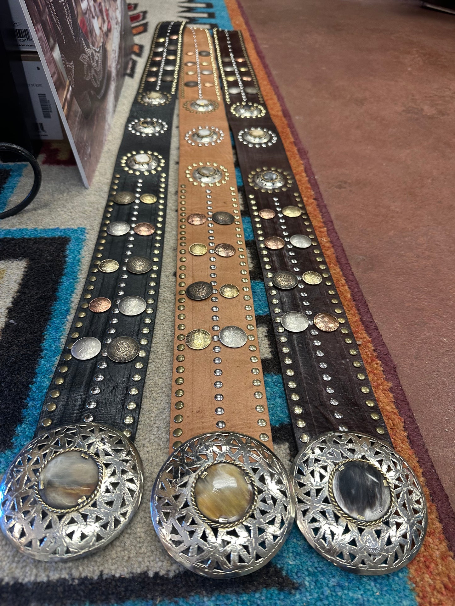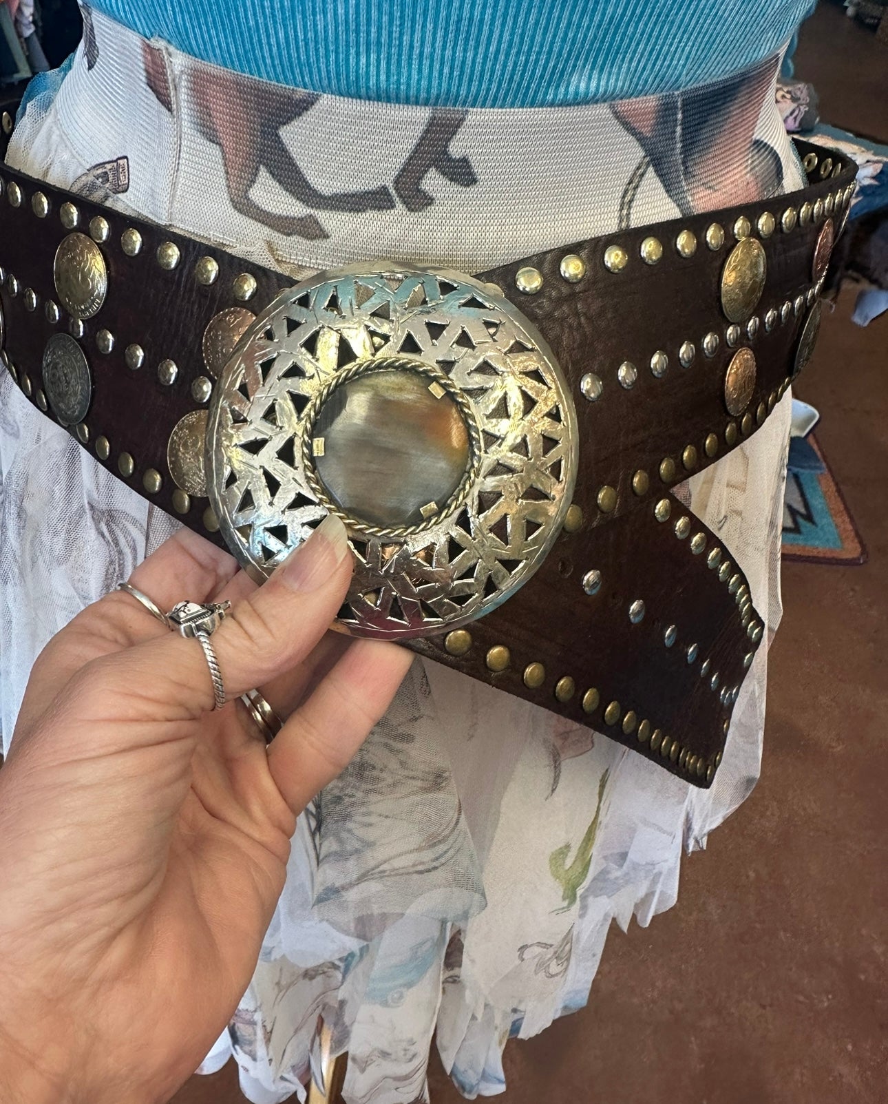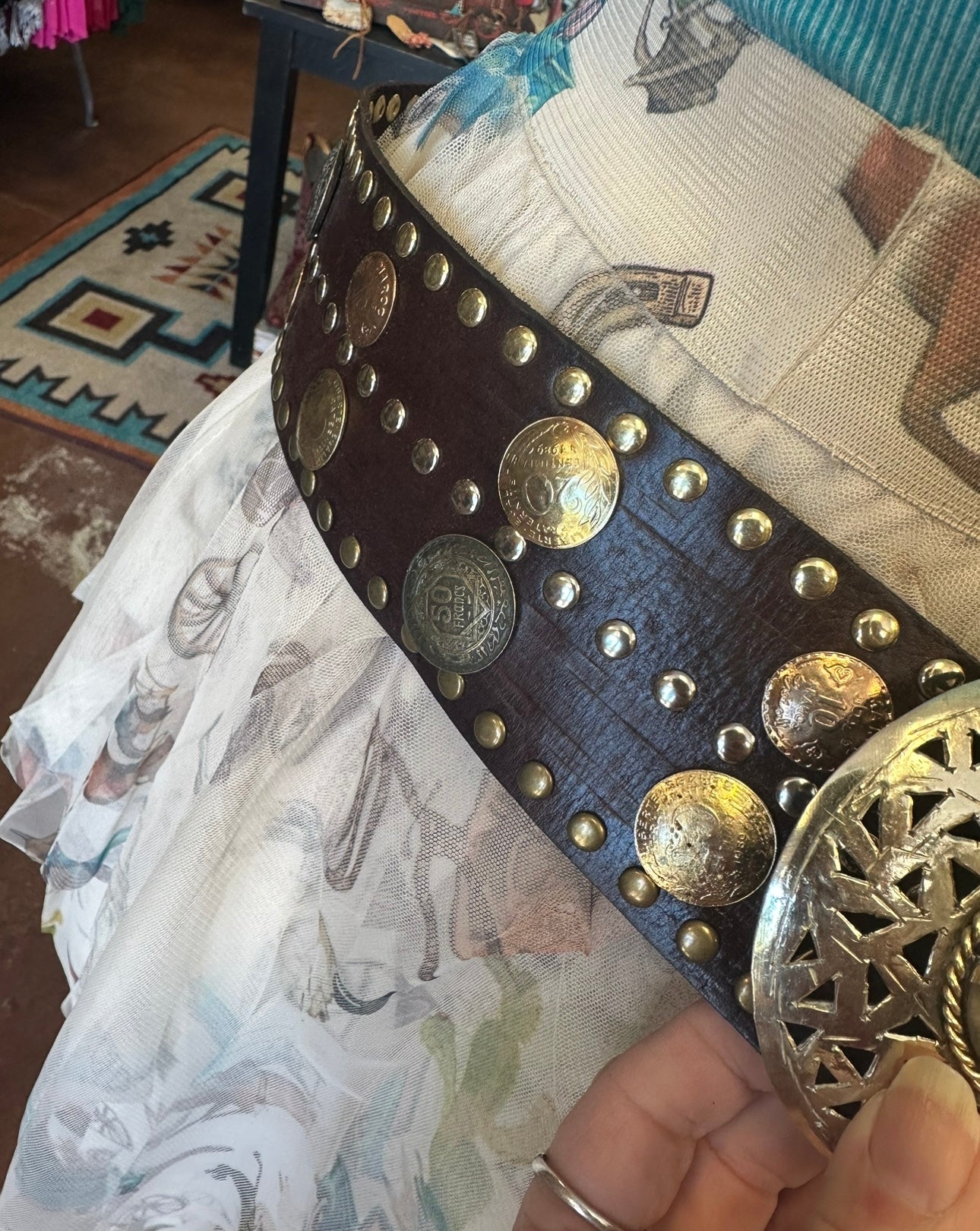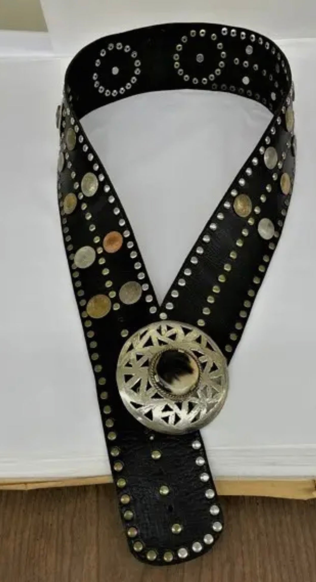 Leather belt with metal, studs, coins and stone accents