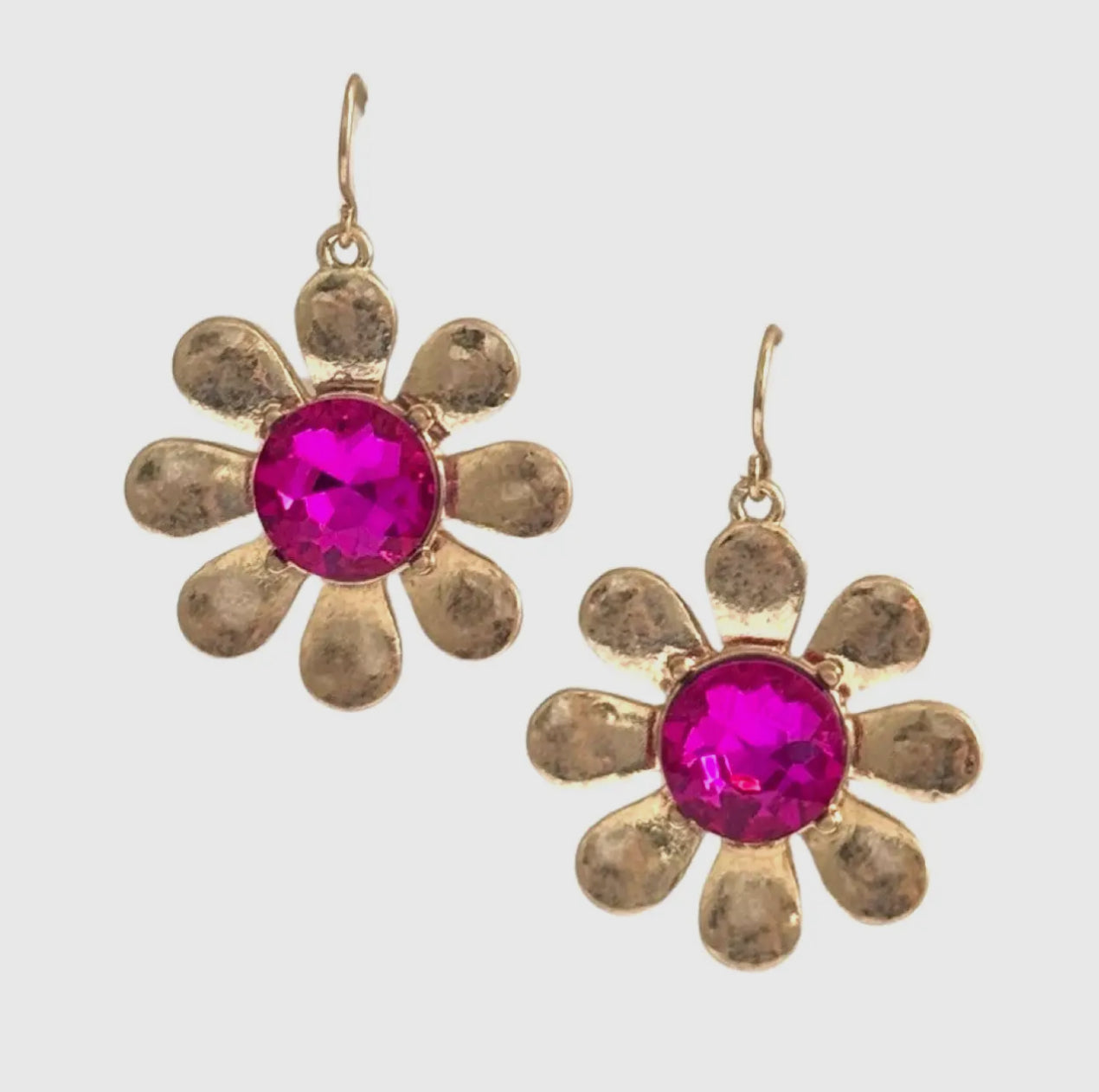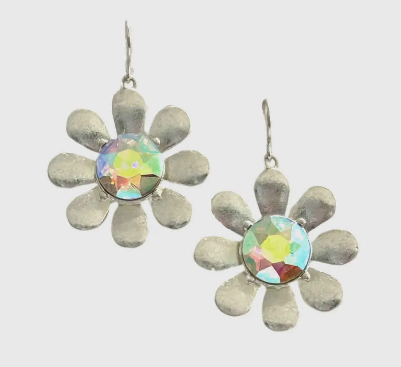 This adorable earring is in the shape of a flower with individual petals and a large rhinestone center.