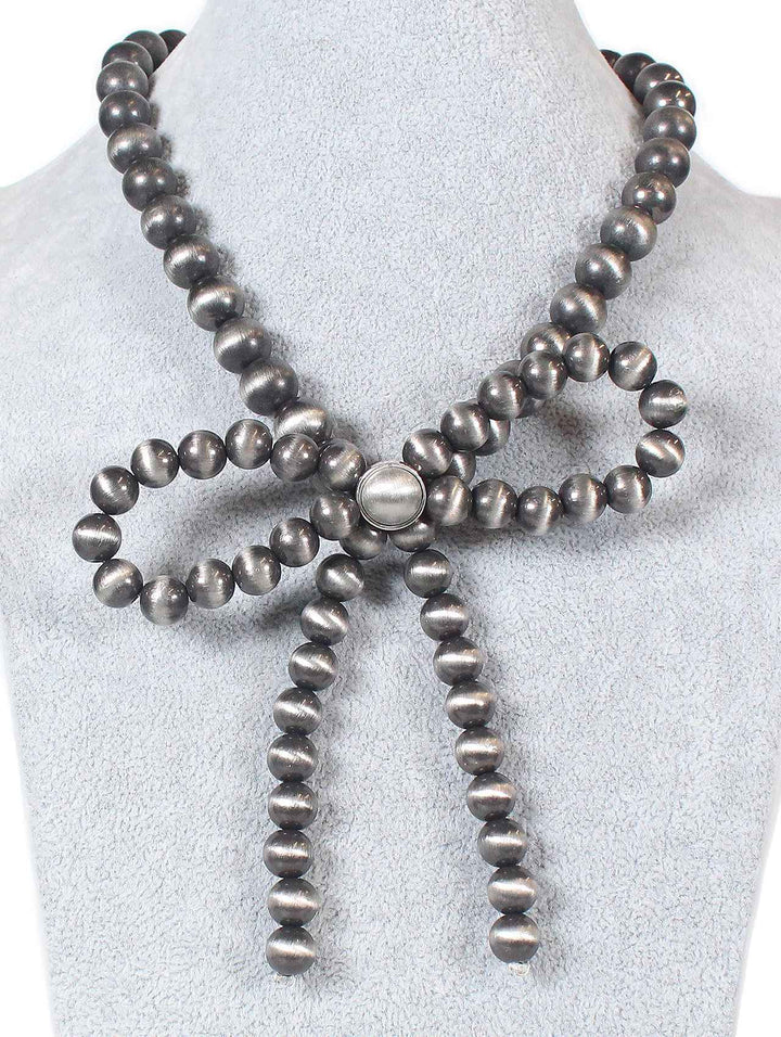 This necklace combines classic Southwestern charm with a delicate ribbon motif. Crafted with polished gunmetal-tone faux navajo pearl beads, the necklace features a bow-shaped pendant as its focal point. The elegant yet playful design makes this piece versatile for both casual and dressy occasions.