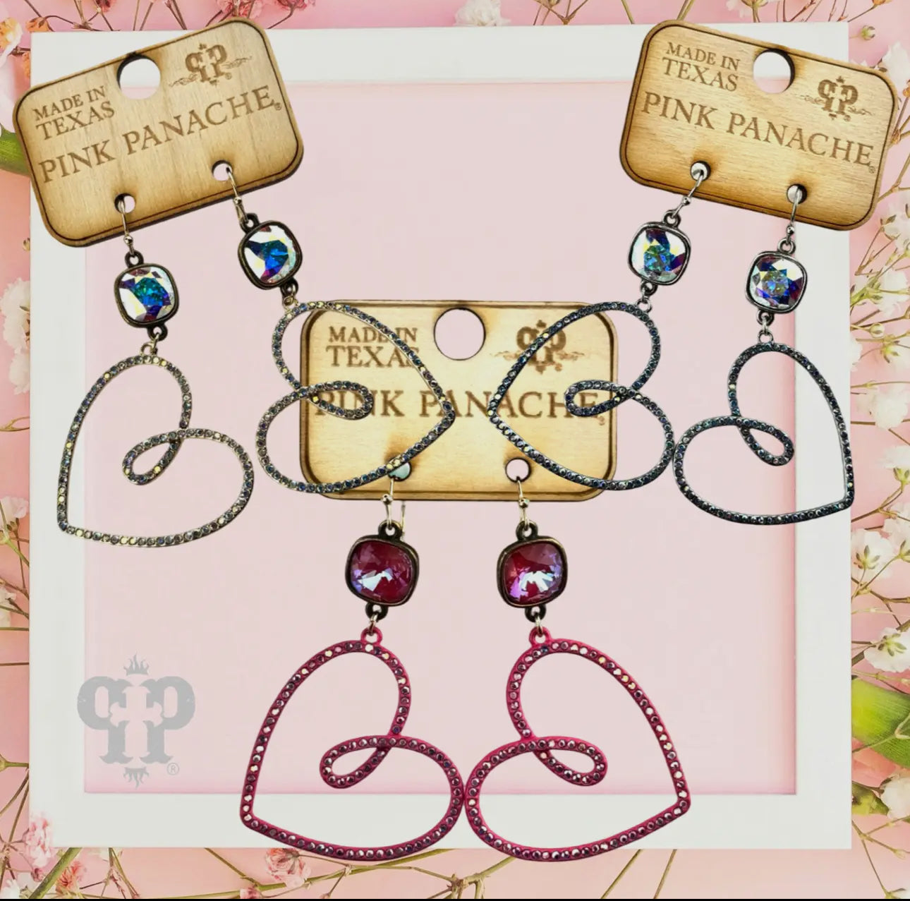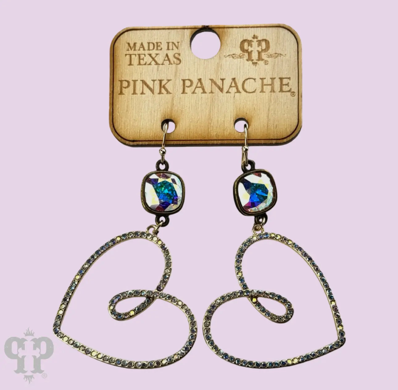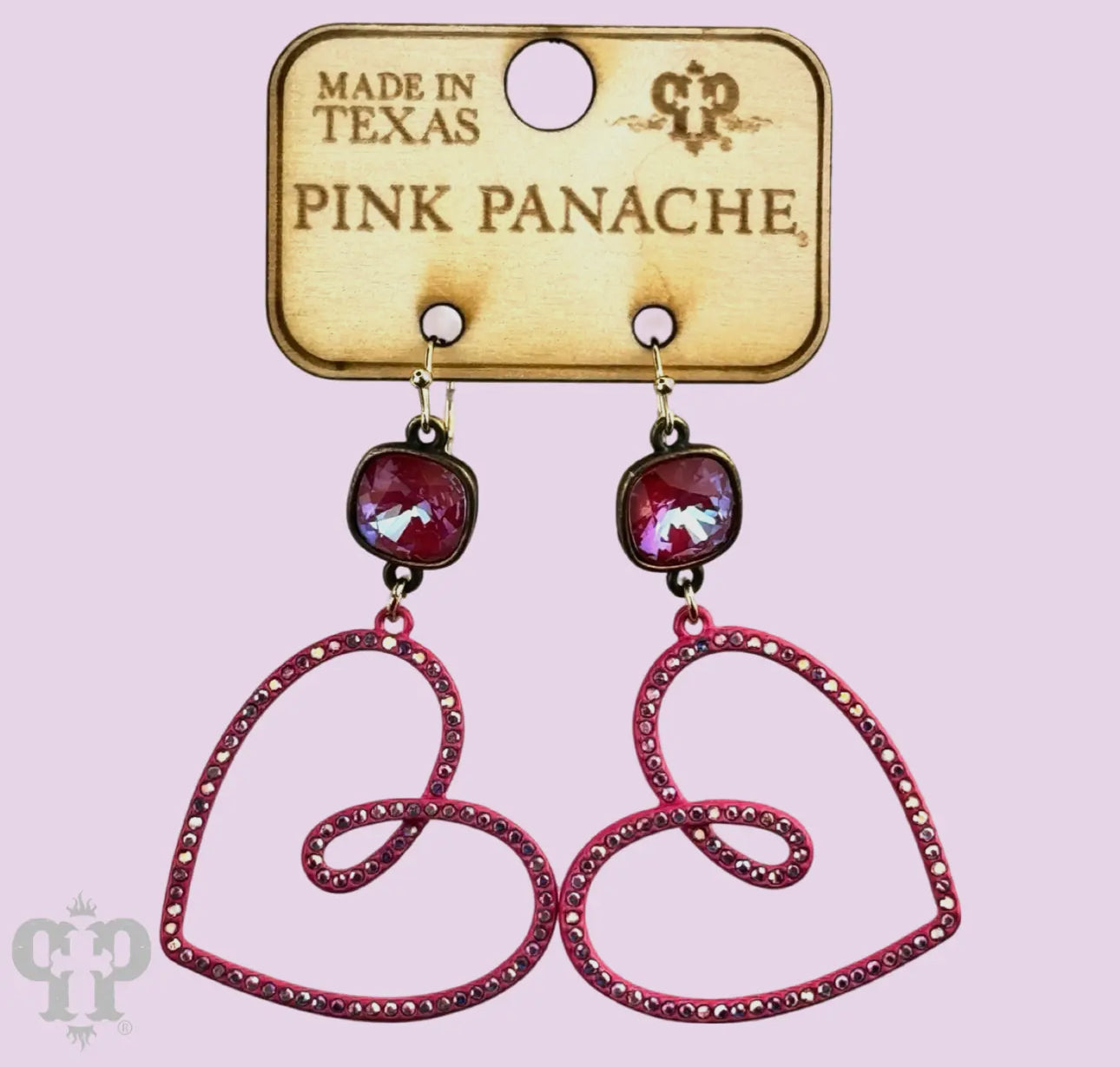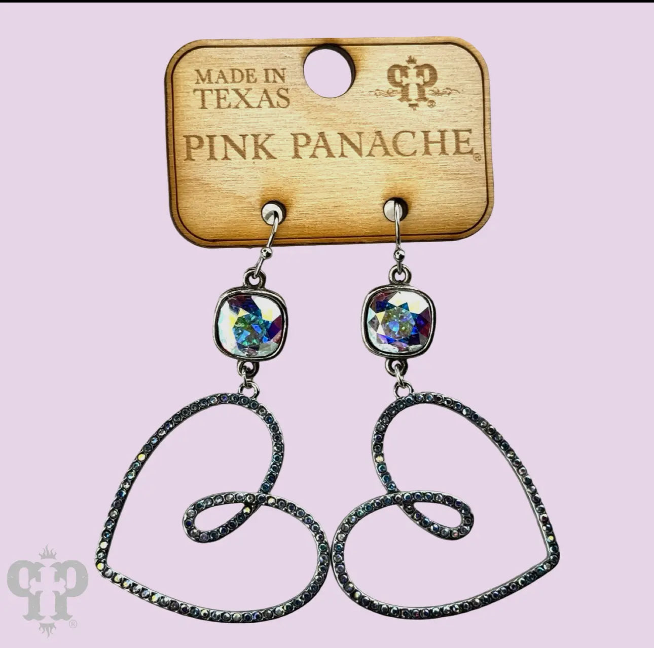 This earring features a pave rhinestone funky heart. It hangs from a 10mm Austrian crystal drop in a setting custom made for Pink Panache in the USA. Approximately 2.25 inches in length.