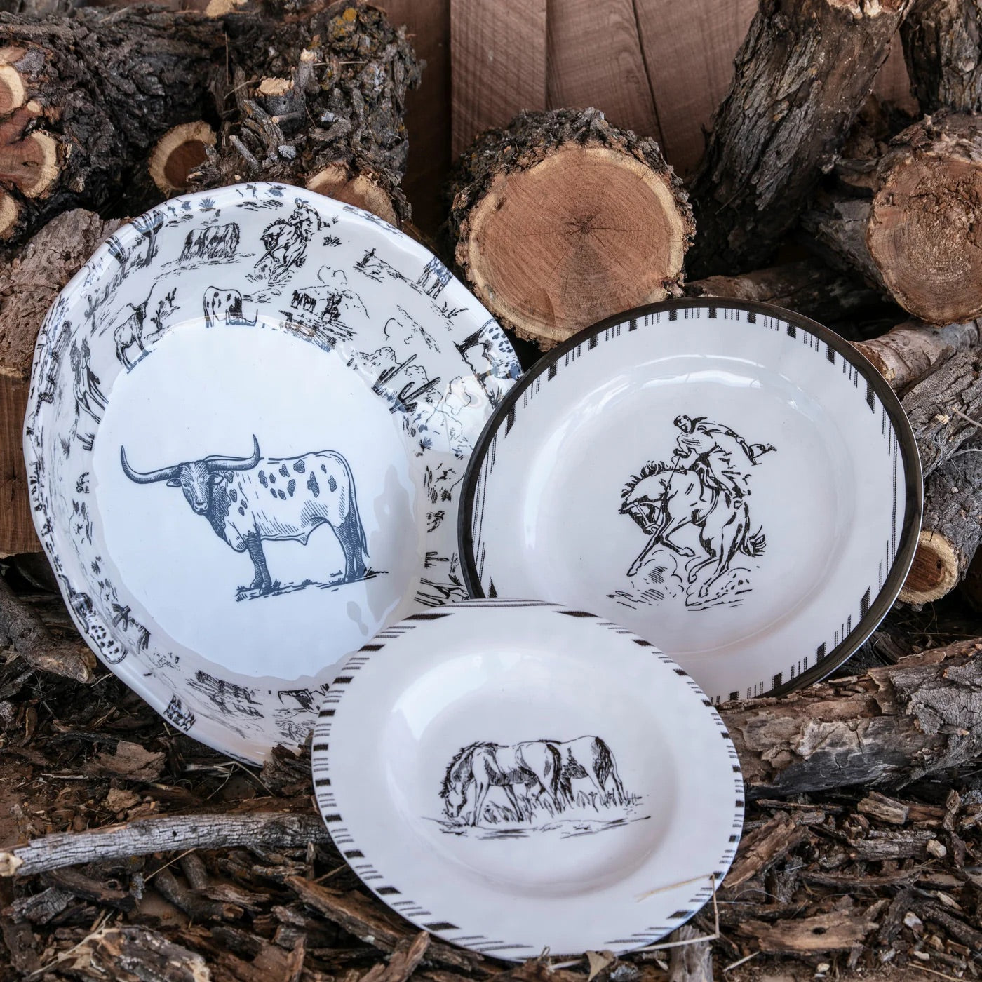 Our Ranch Life Melamine Serving Bowl is a playful way to add Western charm to your dining table. It comes in a versatile black-and-white colorway and depicts a Texas Longhorn in the middle, bordered by natural scenery of the West. Complete a rich rustic dining ensemble when you coordinate with other dinnerware in our Ranch Life Collection.