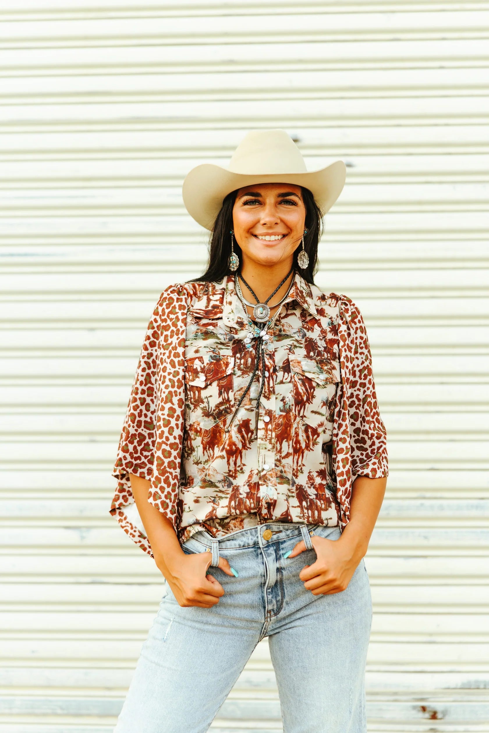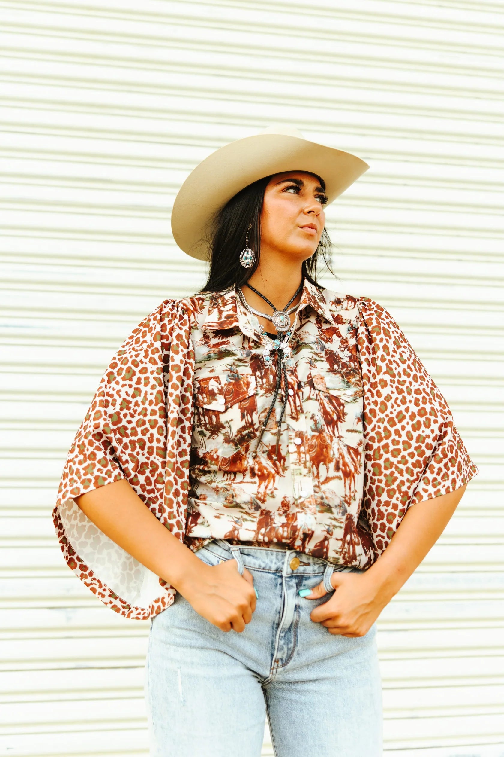 The Red Yeehaw Blouse/ Cowboy Cheetah tops offers a bold, eclectic mix of western-themed motifs. This top delivers standout character. Designed with a button-down front and wide 3/4-length kimono sleeves, the relaxed silhouette suits casual western wear or boutique statement styling.