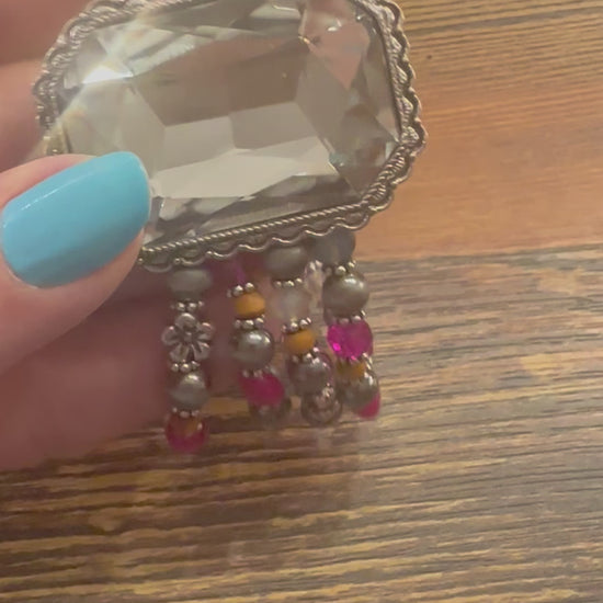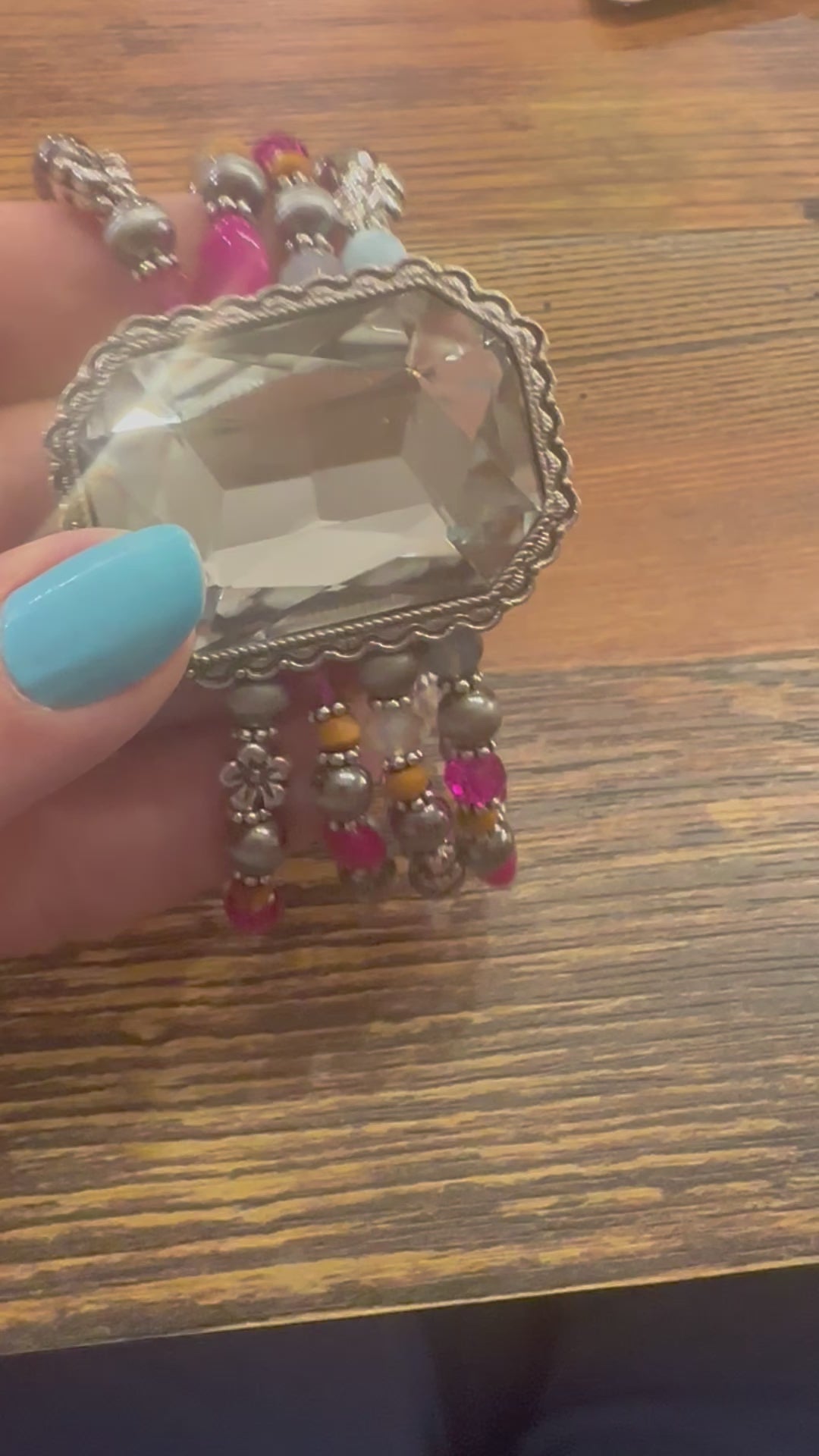 This bracelet has four strands of burnished silver and stone beads with spacers coming off a large octagon shaped rhinestone. One size fits most and is a stretch bracelet.