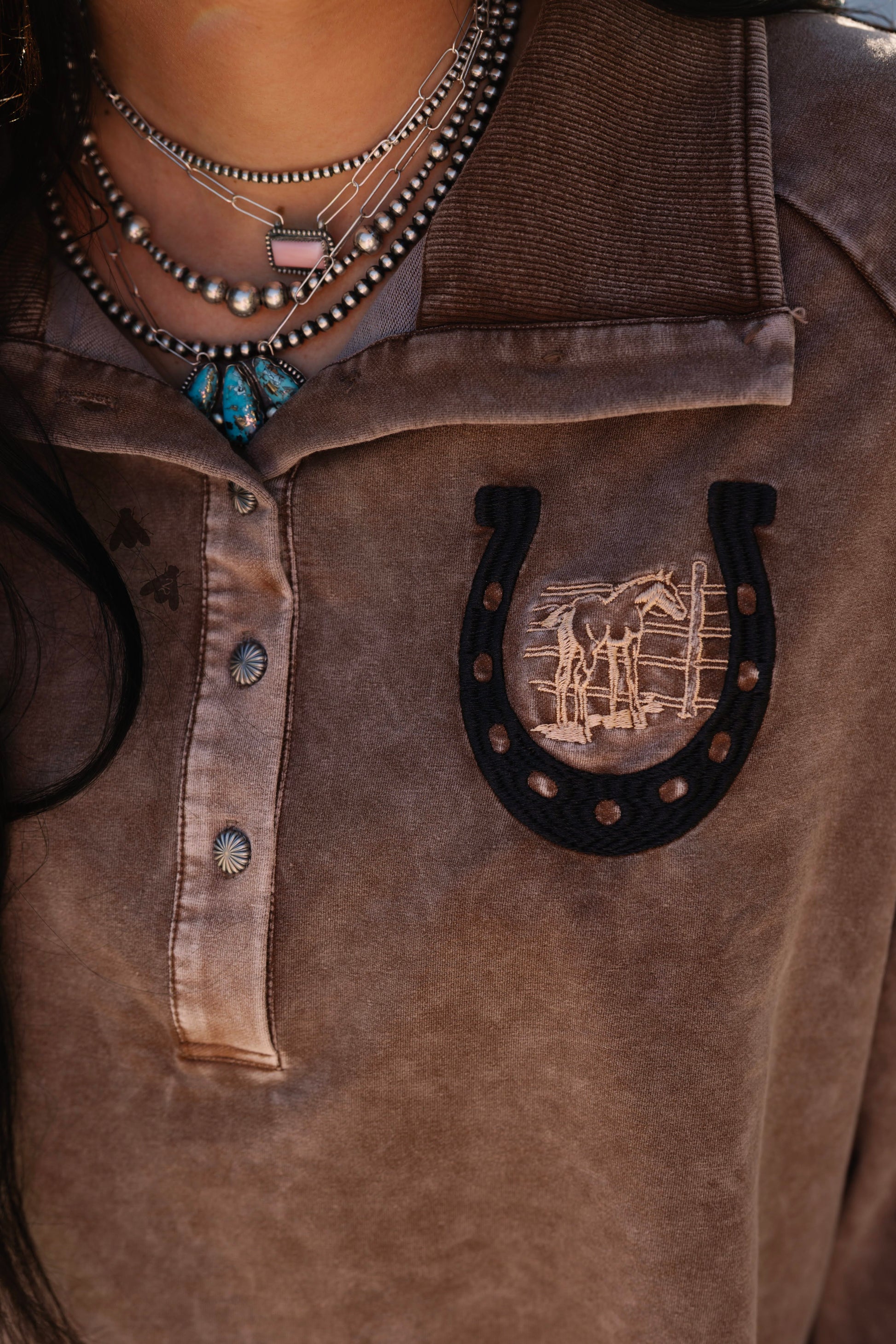 casual pullover BUT take it up a notch. this pullover is rocking embroidery, concho buttons, and a cool wash effect. & it's SUPER COMFY. it's a win win.