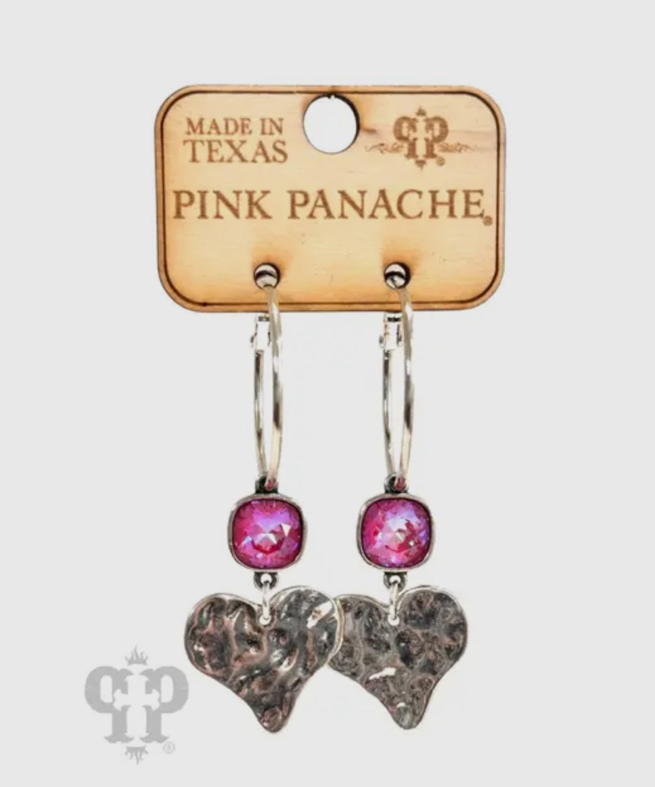 This earring has a hammered look silver heart and 10mm royal red delite Austrian crystal in a setting custom made for Pink Panache in the USA. It hangs from a silver tone hoop and is approximately 2 inches in length.