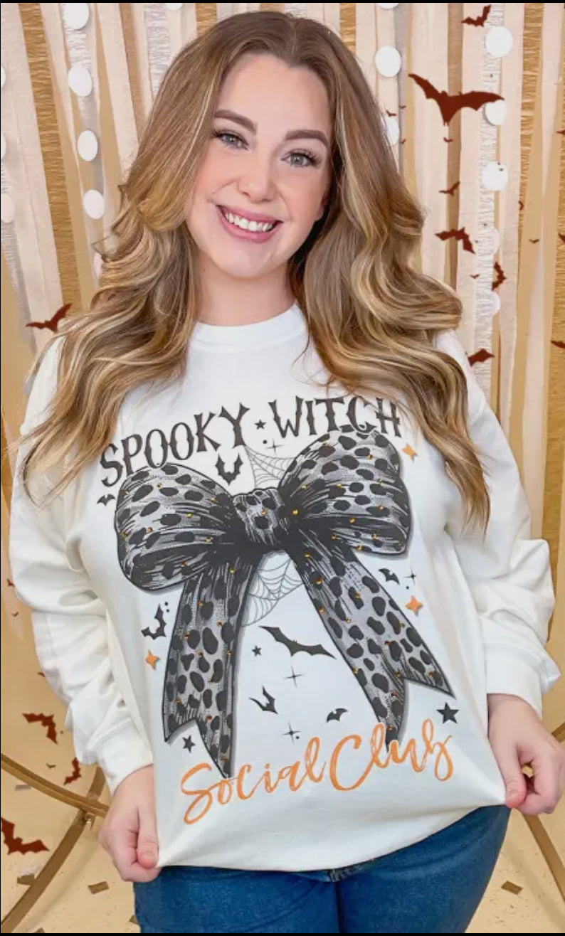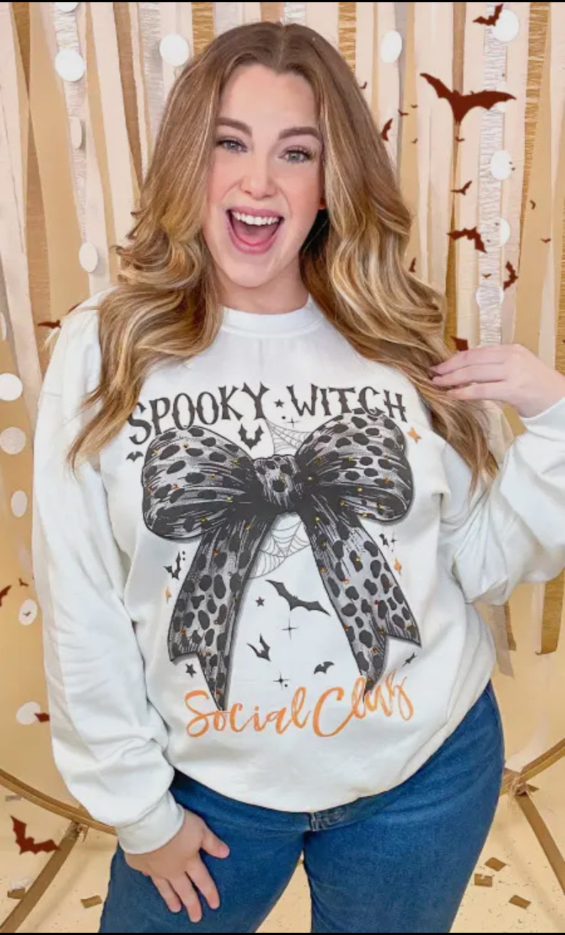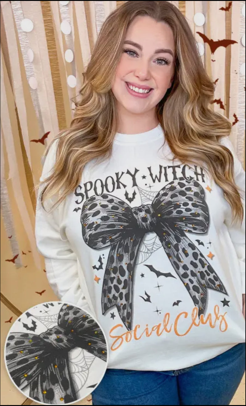 This graphic sweatshirt's design features a black and grey cheetah-print ribbon bow with cobwebs and bats, along with the words, "SPOOKY WITCH SOCIAL CLUB." on top.