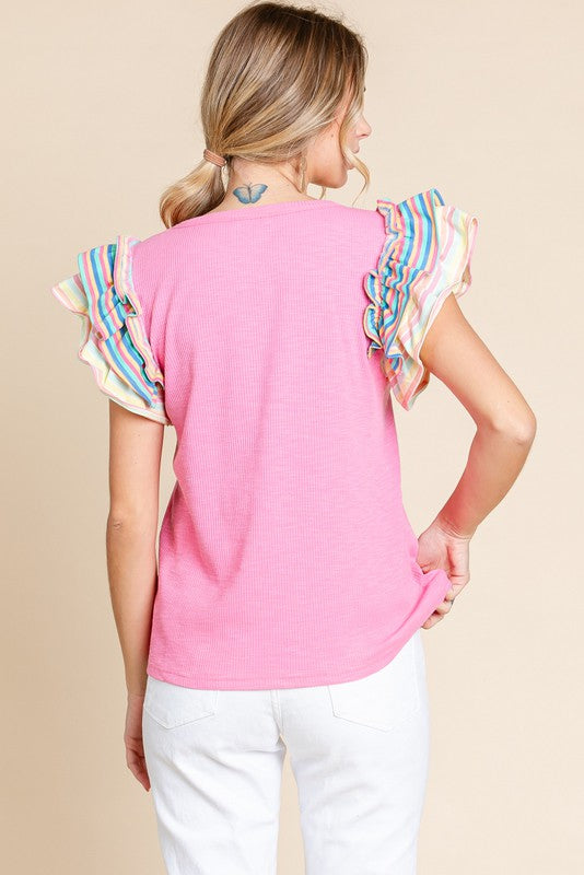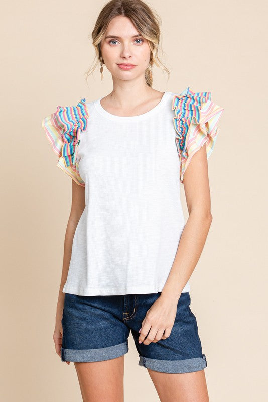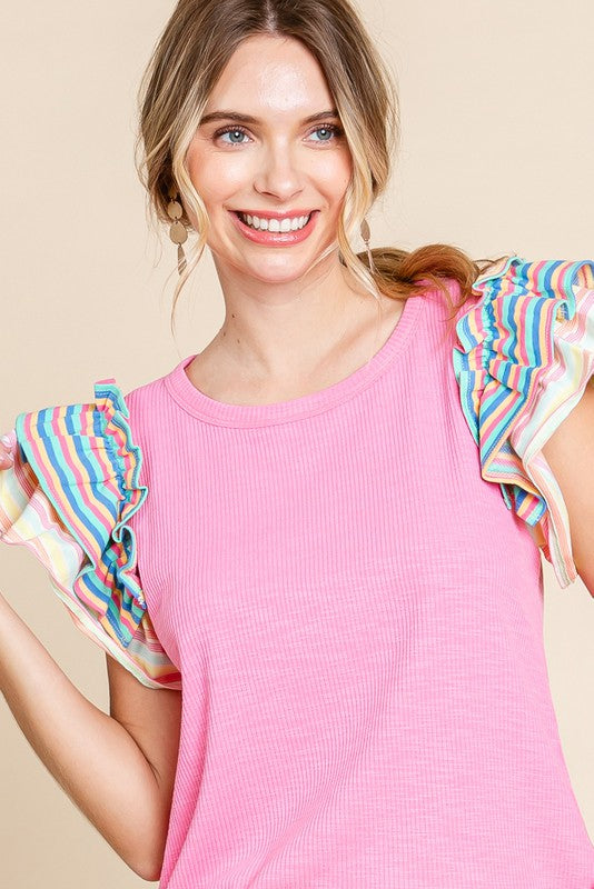 Ribbed top with U-neck, layer flutter sleeves featuring striped print.