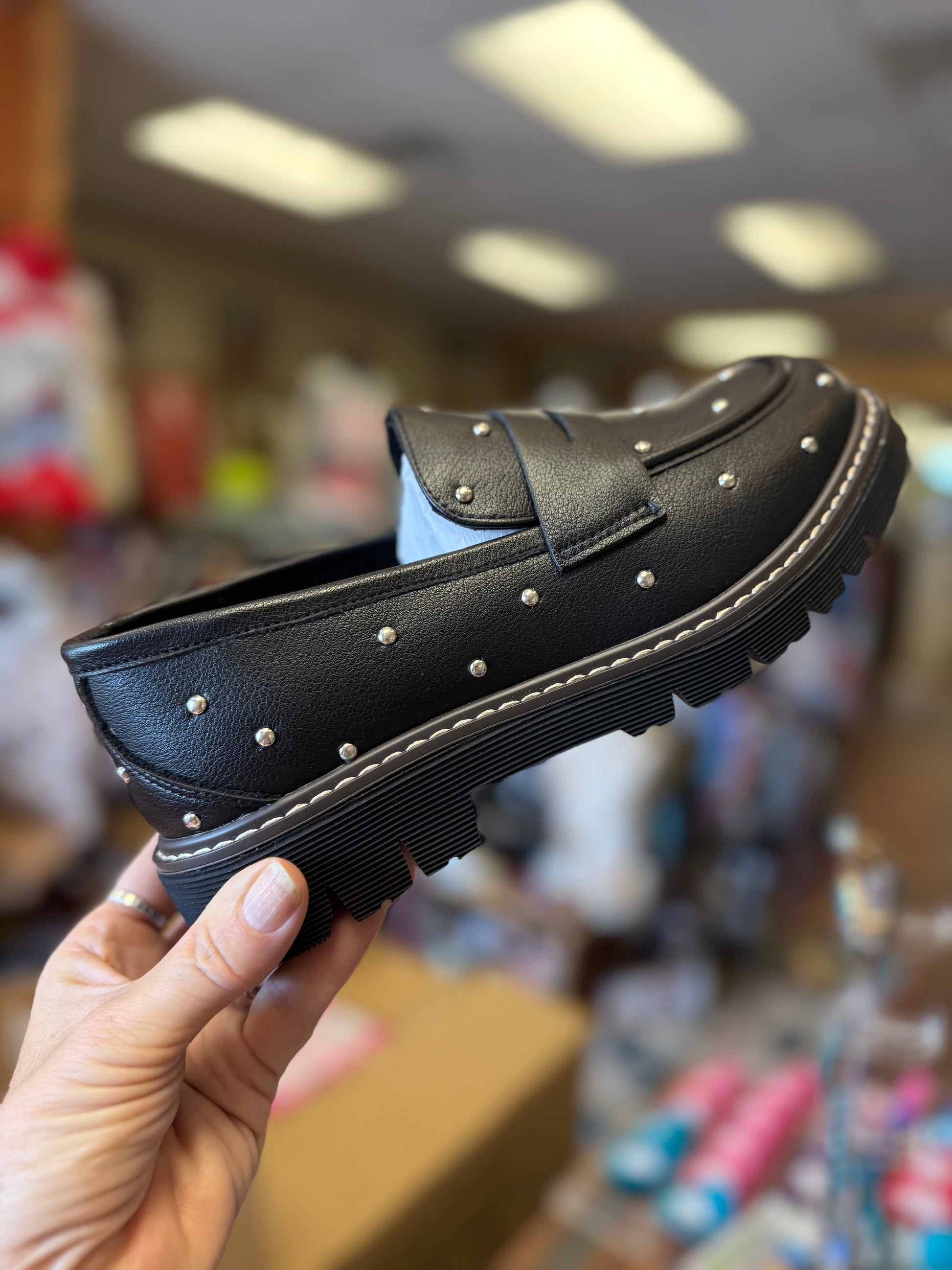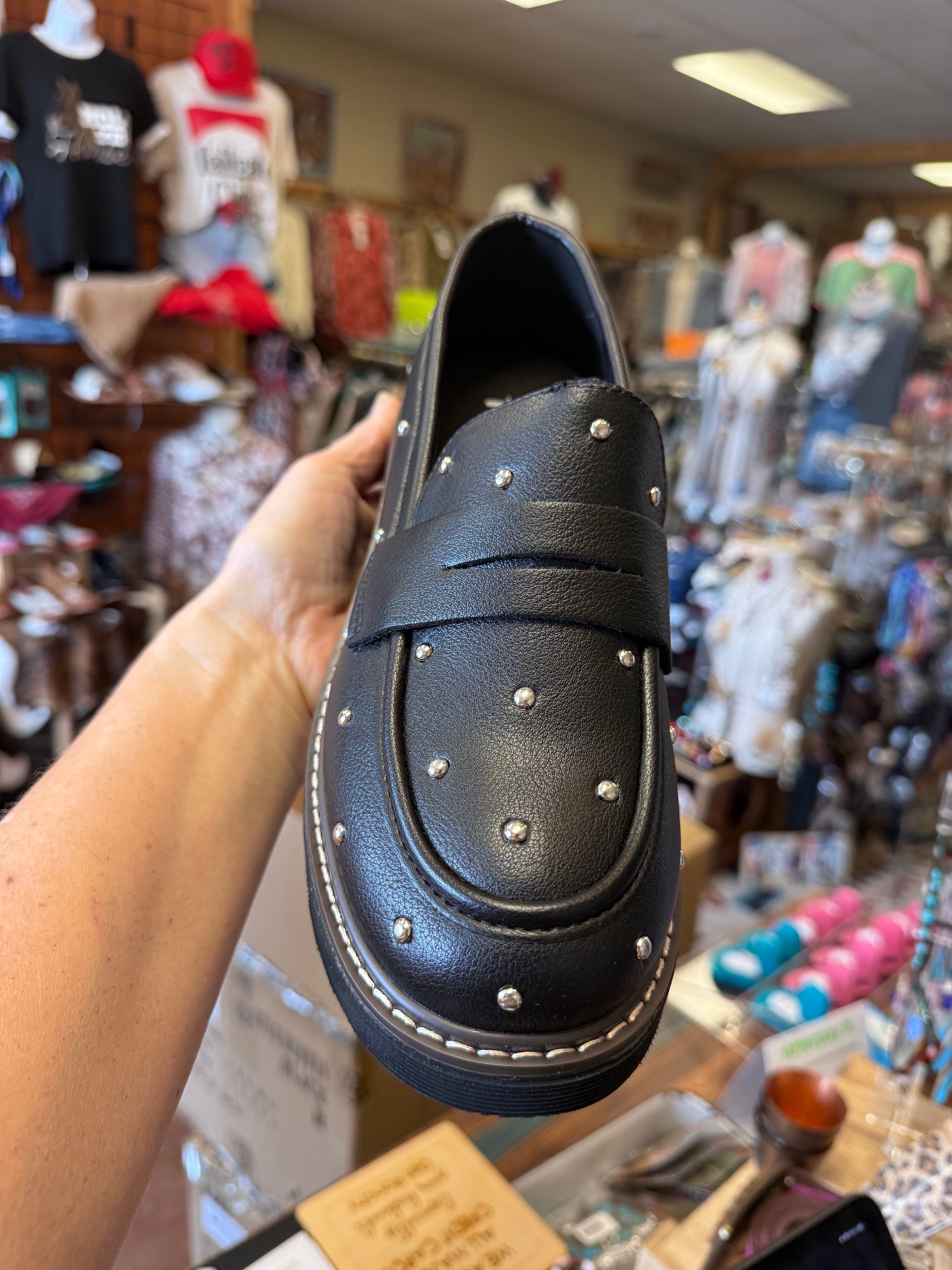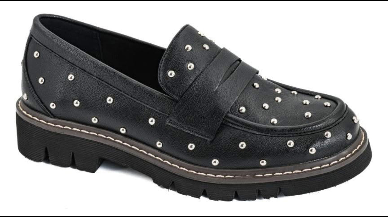 Elevate your collection with the Hey Girl Stud Muffin Loafers - where edgy style meets all-day comfort. Featuring a chic studded upper and a flattering 1.5" heel, these loafers are perfect for customers who want fashion and function in one sleek package.