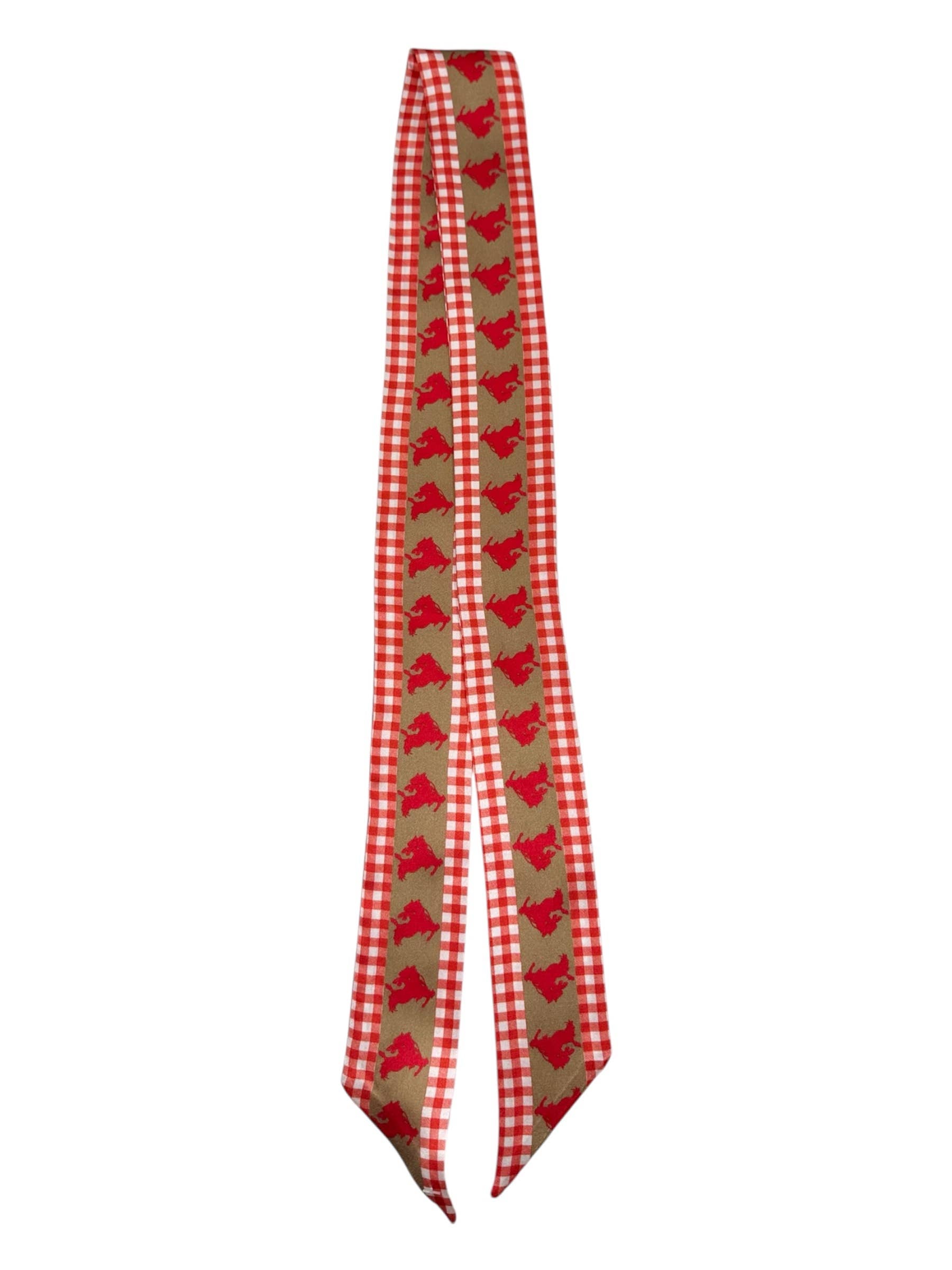 Tan Silk Twilly Scarf with Red Buck Horse and Red Gingham