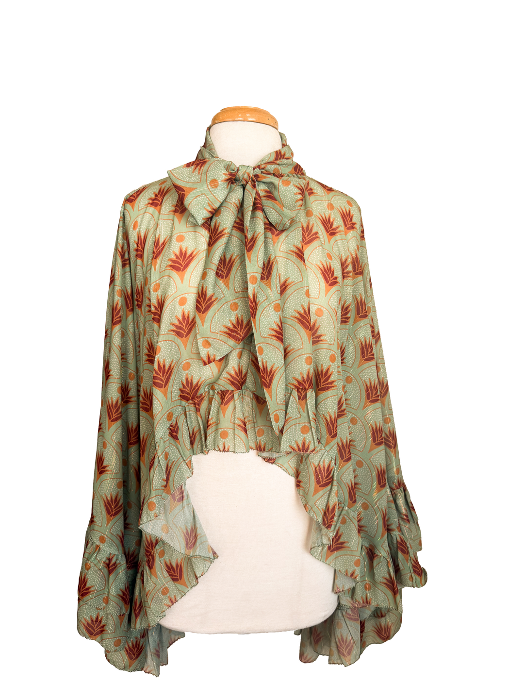 Cropped in the front. Long in the back with a tie around the neck that can be tied all the fun ways!