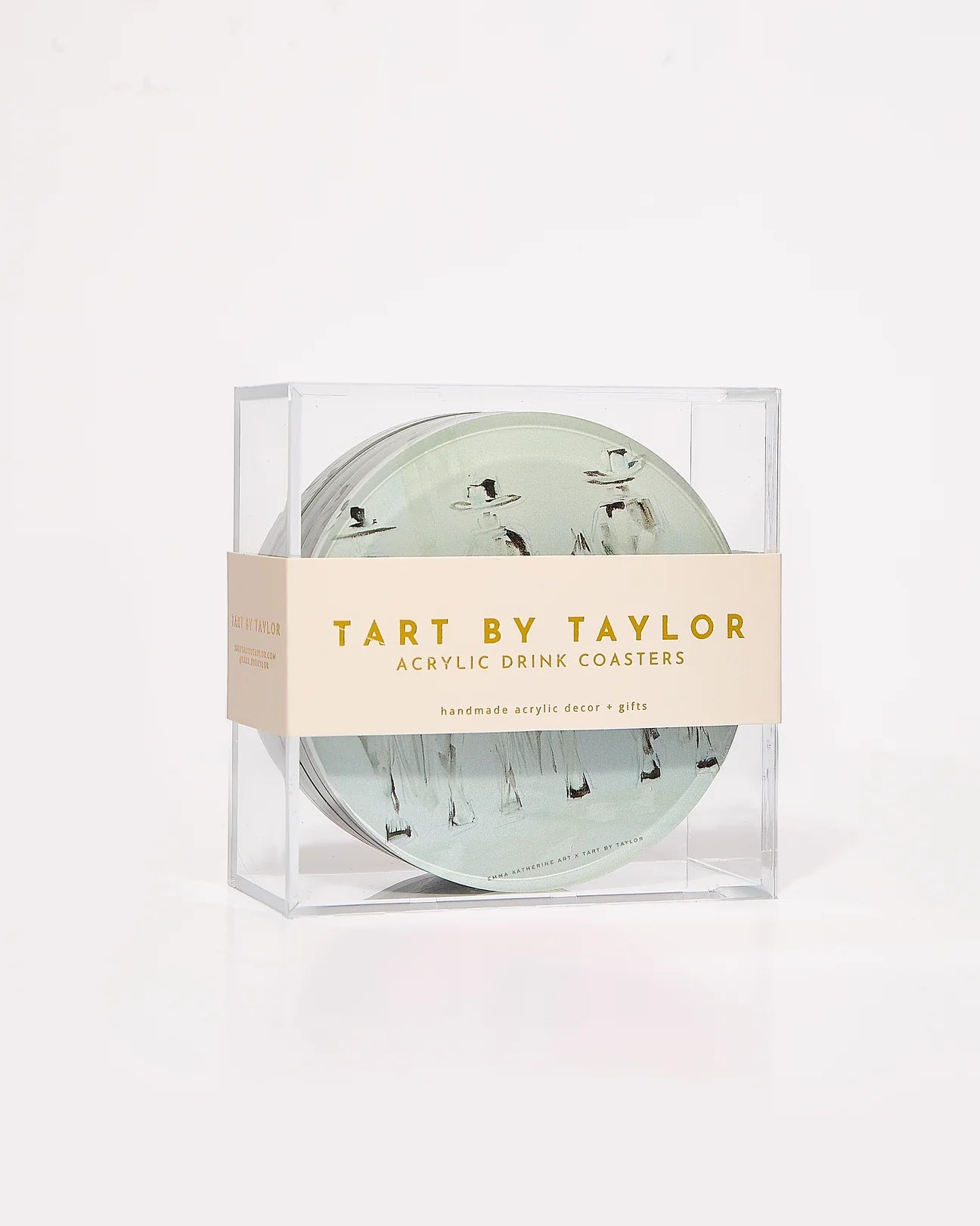 - A set of four, packaged in a sleek acrylic display box with a coordinating band
