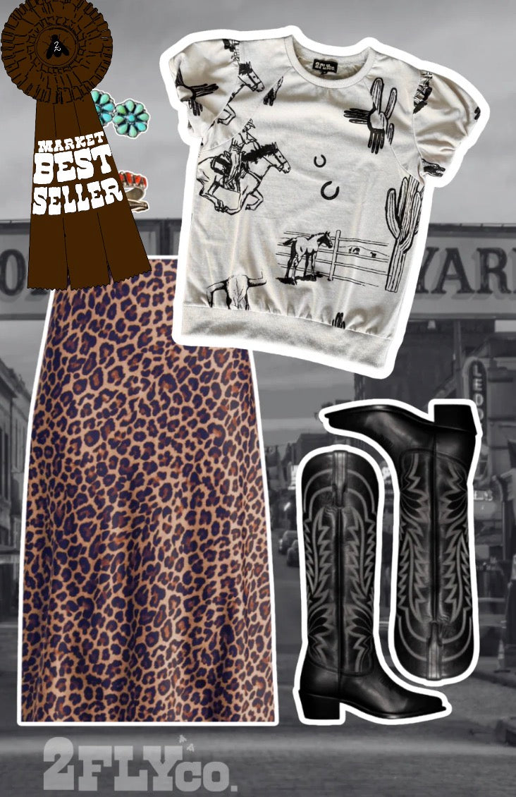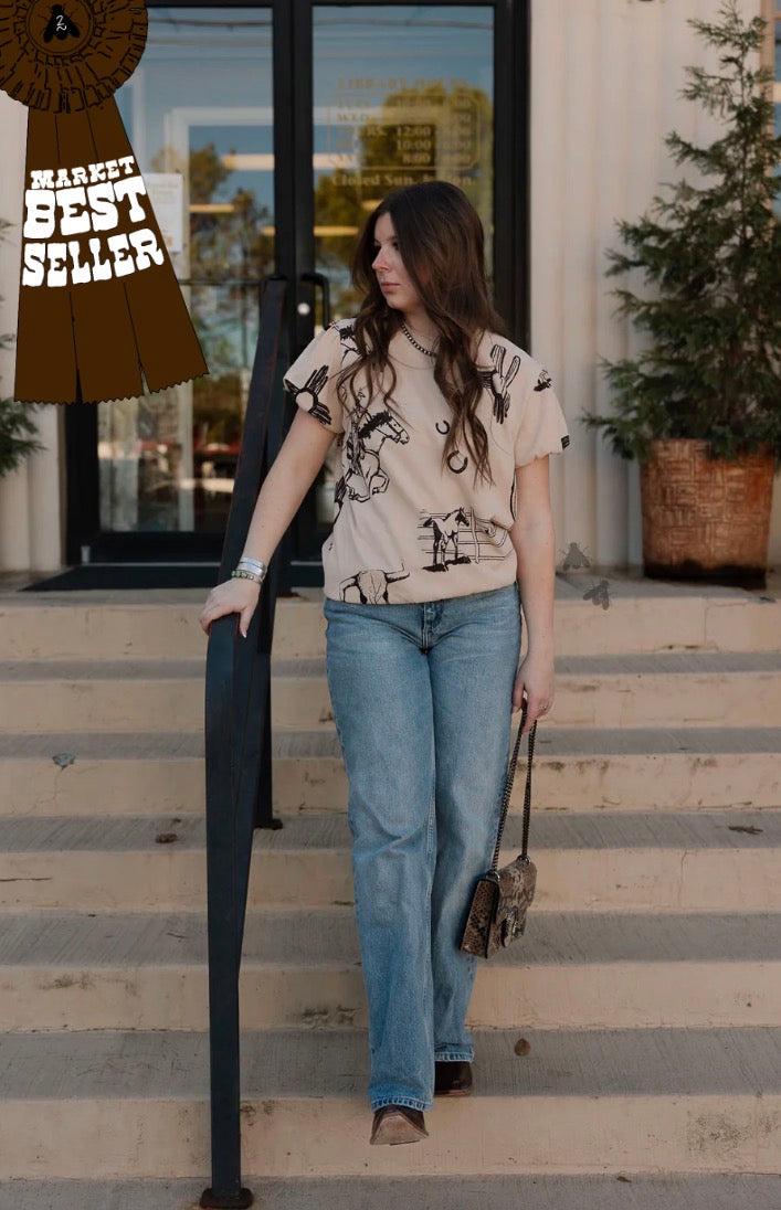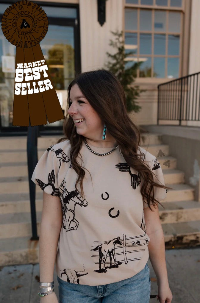 it's 100% cotton and giving all the western feels. this top has some girliness with western graphics. we are loving the puff sleeve details. there is a band at the bottom that can be tucked in to hide or rock it with the band out.