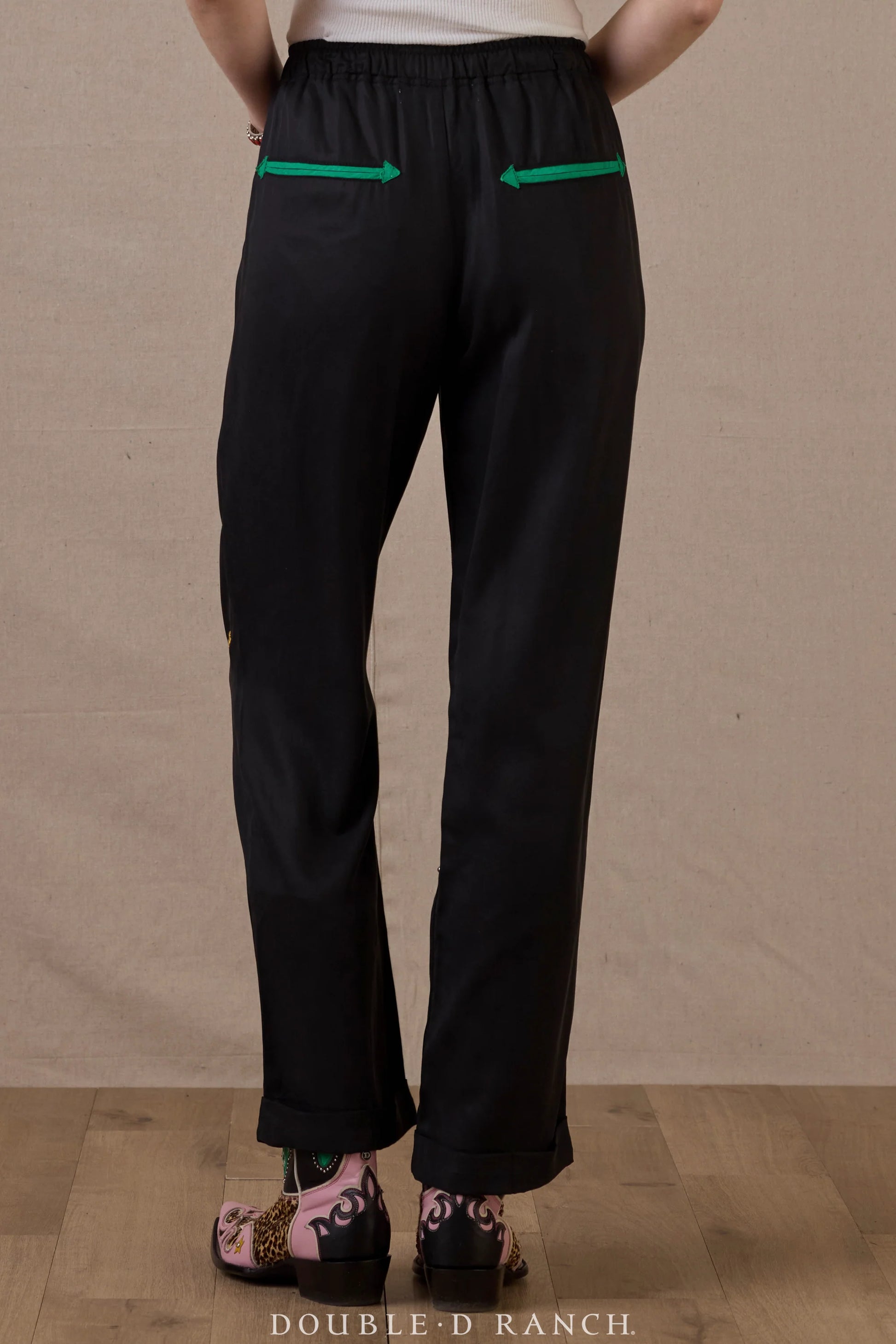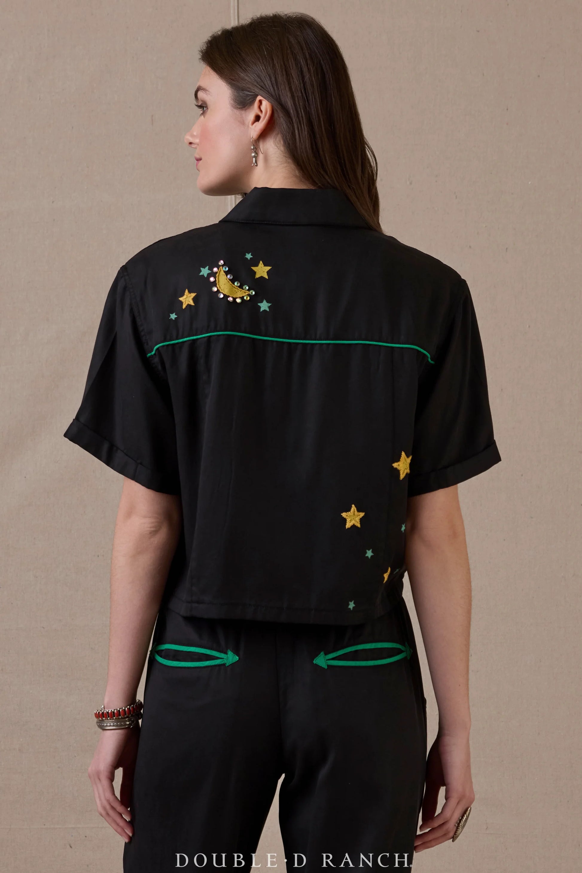 Nudie-inspired style meets a modern silhouette in these cute cropped-and-cuffed joggers! The motif is a retro roadside motel under a starry sky, brought to life on a bold black tencel pant, finished with Western welts and a little bit of bling.