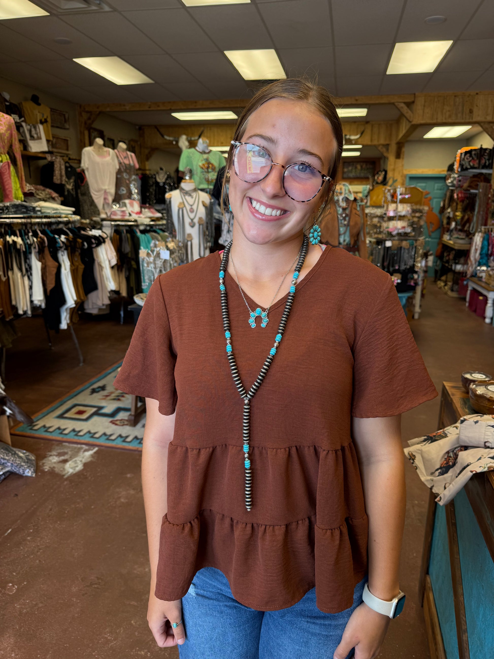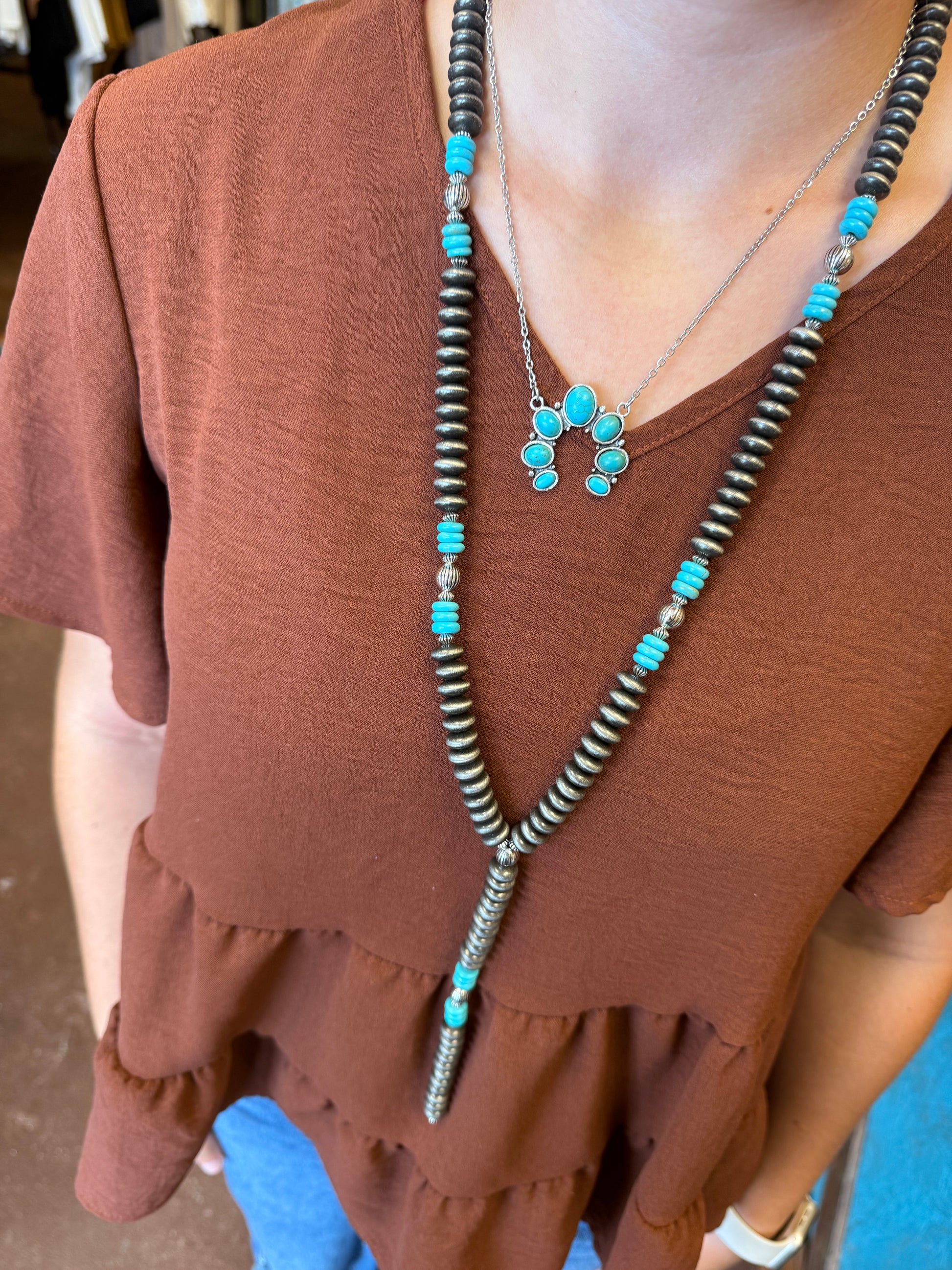 27” w 6” tail faux Navajo Pearl disc beaded necklace with turquoise accents