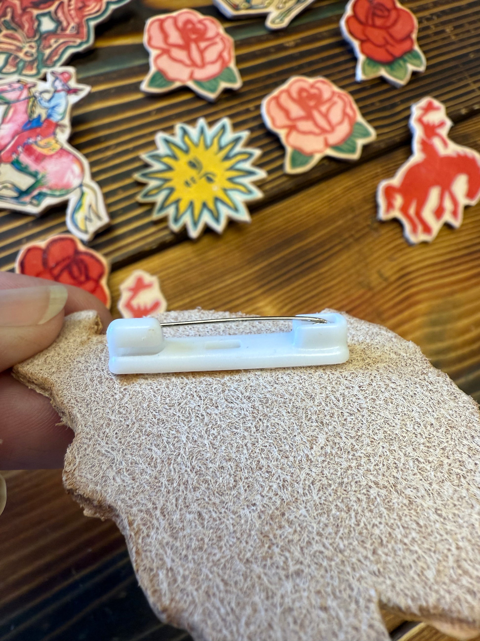 These handmade leather pins are great for everything. Put them on your jacket, hats, scarves, purses, backpacks, etc. They are the perfect addition to make anything extra cute!